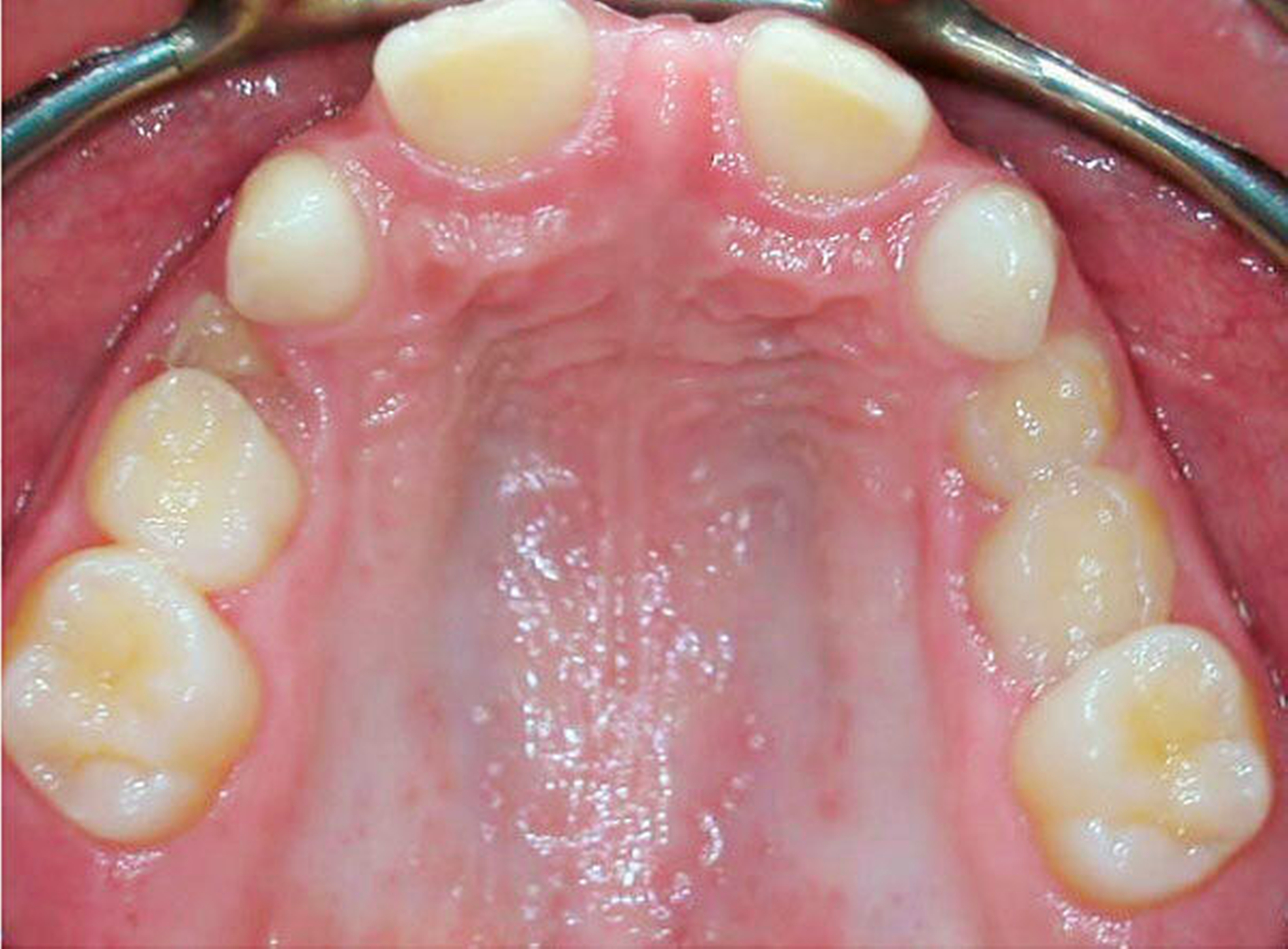 Im Alter von 17 Jahren, also 5,5 Jahre post transplantationem, sind deutliche Fortschritte der kieferorthopädischen Behandlung mit dem Ziel der Bisshebung erkennbar (Abbildung 6). Um einen vorzeitigen Verlust der Milchzähne durch KFO-Zug zu vermeiden, entschied sich die Kieferorthopädin gegen eine Bewegung der Milchzähne in Position 13, 12, 22 und 23. Die Milchzahntransplantate in Position 12 und 22 weisen jetzt deutliche Zeichen einer apikalen Resorption auf, was bei plötzlichem Verlust die Einleitung implantologischer Maßnahmen zur Folge hätte.