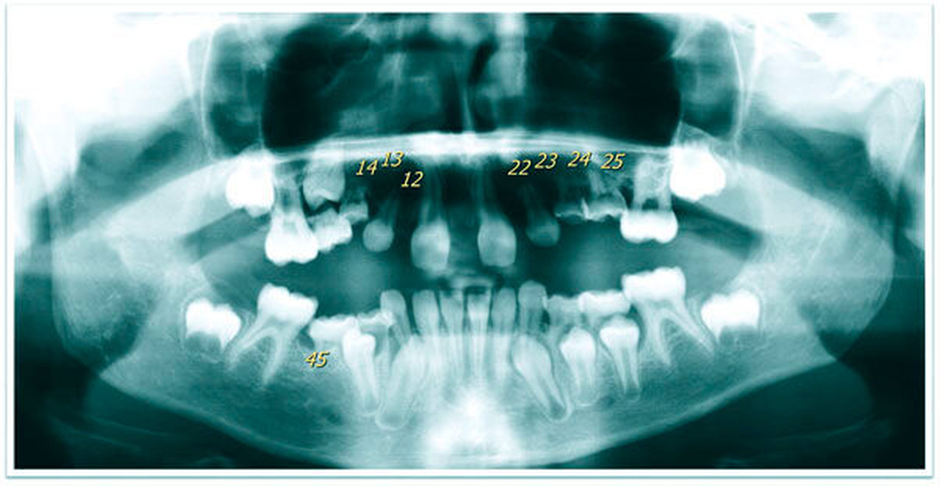 Die erhebliche Infraposition der Milchmolaren im Fall der zehnjährigen Patientin (Abbildung 1c) sollte alle zahnärztlichen Fachgebiete in erhöhte Alarmbereitschaft versetzen, denn dies ist fast regelhaft mit Komplikationen an Ort und Stelle verbunden [Bokelund et al., 2015]. Bei einer sich abzeichnenden Infraposition von Milchmolaren sollte daher immer eine Bildgebung erfolgen, um mögliche Nichtanlagen nachfolgender Zähne auszuschließen oder andere damit assoziierte Durchbruchsstörungen früh zu erkennen.