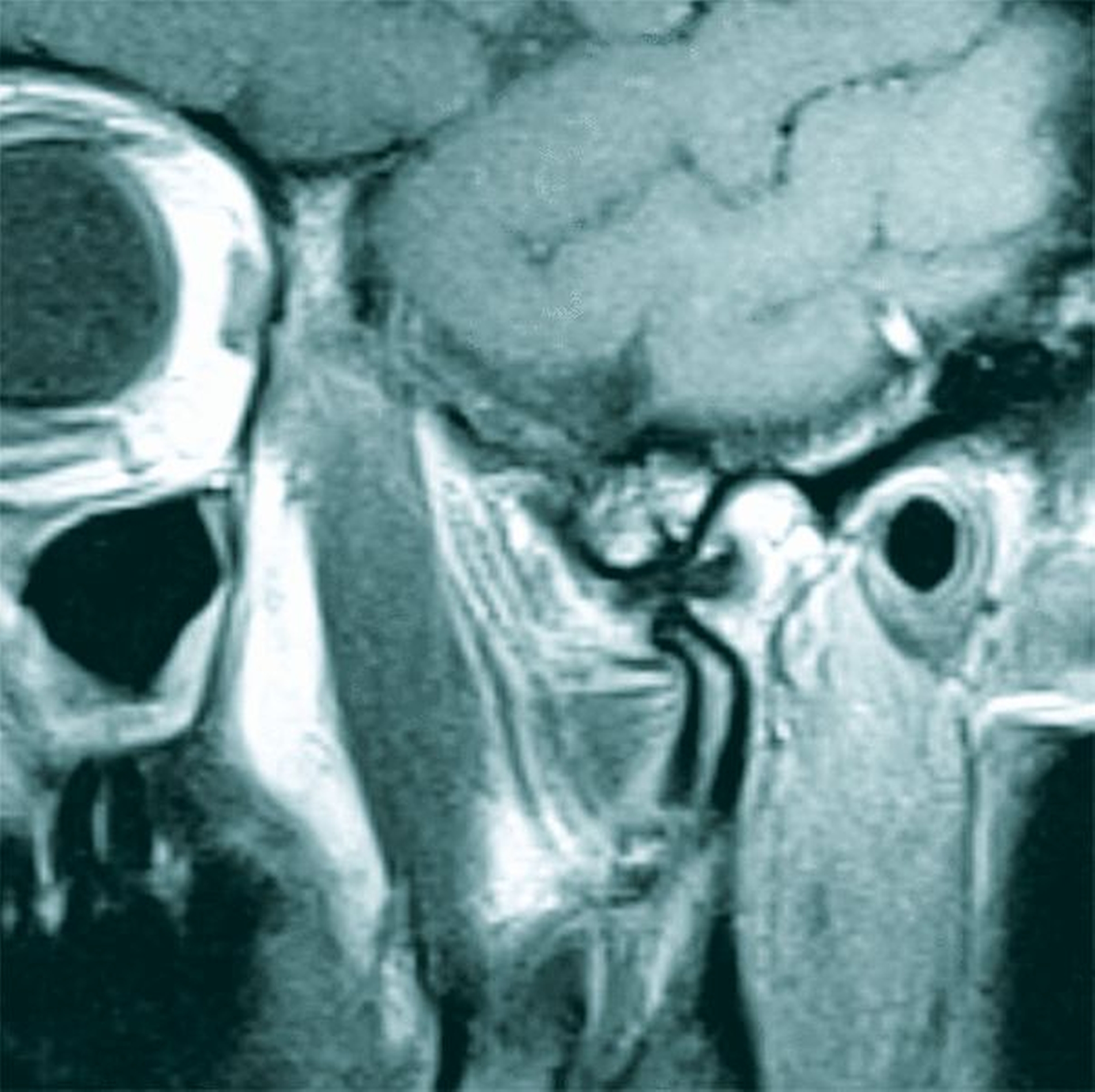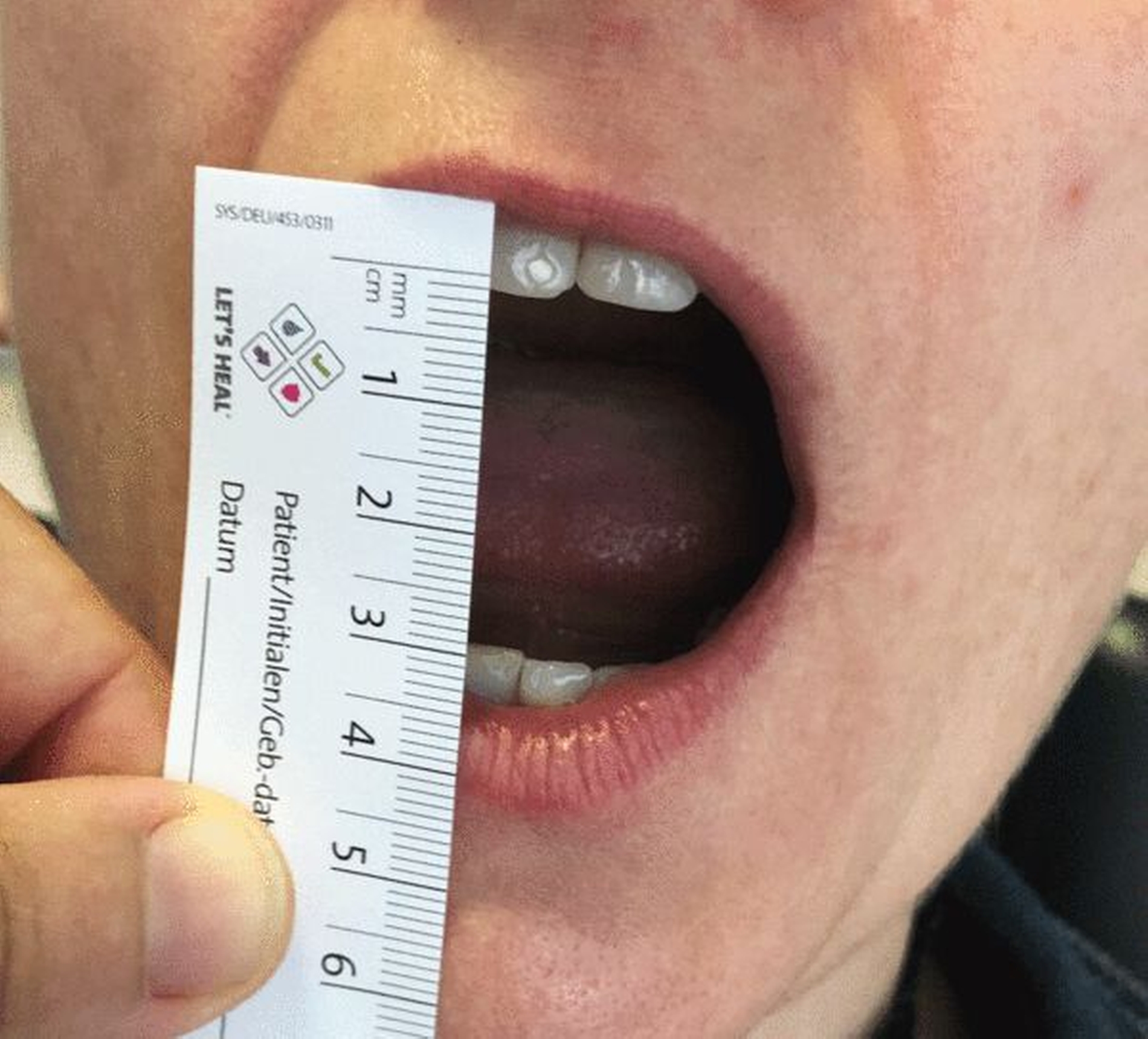 Eine 42-jährige gesunde Patientin stellte sich mit einer Bewegungseinschränkung des Unterkiefers vor. Durch eine schmerzhafte Einklemmung im Bereich des Kiefergelenks rechts kam es zu einer kombinierten Kieferklemme und -sperre, die in einer bei circa 1 cm Schneidkantendistanz federnd-fixierten Mundöffnungsstörung resultierte (Abbildung 1). Die Beschwerden begannen anamnestisch vor ungefähr drei Jahren mit rezidivierenden Schmerzen und Bewegungsstörungen, wobei sich insbesondere in den vergangenen zwölf Monaten eine progrediente Verschlechterung mit weiterer Einschränkung der Mundöffnung gezeigt hatte.