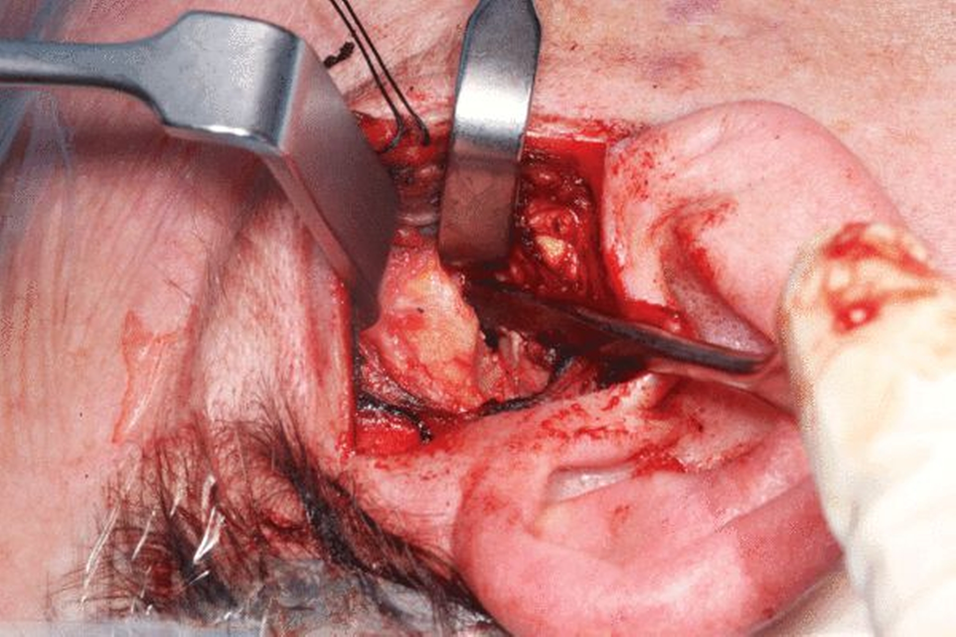 Die Eminektomie stellt eine valide Methode im Falle eines „Closed Lock“ zur Erzielung einer verbesserten Diskusbeweglichkeit dar [Stassen und Currie, 1994; Chakraborty, 2007], wobei auch Alternativansätze wie die Diskusreposition mit Fixierung des reponierten Knorpels an der Dorsalseite des Gelenkes, Ersatz des Diskus durch beispielsweise Silikoninterponate oder die Diskektomie mit und ohne Einlage von autologen Transplantaten berücksichtigt werden müssen [Candirli et al., 2017]. Das Hauptziel der Eminektomie ist die Beseitigung mechanischer Störungen des Kiefergelenk-Meniskus, der anteromedial zwischen Kondylus und Tuberculum articulare liegt. Die Eminektomie wurde in dem vorliegenden Fall analog zur Literatur [Candirli et al., 2017] als chirurgischer Eingriff der Wahl präferiert, da die folgenden Kriterien vorlagen: lokalisierte Kiefergelenksschmerzen, starke Kiefergelenksgeräusche und mechanische Störungen während der Bewegung sowie fehlende ossäre Pathologien und ein gesund erscheinender Meniskus ohne Perforationen.