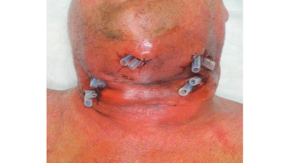 Die Wundheilung verlief unter intravenöser Antibiose und antiseptischer Lokaltherapie regelrecht, sodass sich sowohl die Rötung als auch die Schwellung zurückbildeten und die Wundoberfläche granulierte (Abbildung 5). Aufgrund der Größe des Gewebedefekts und der Exponierung der Halsgefäße erfolgte am 40. postoperativen Tag eine Defektdeckung mit einem mikrovaskulär anastomosierten, septomyokutanen Transplantat vom Oberschenkel (ALT-Lappen). Erneut wurde der Patient aufgrund des schlechten Allgemeinzustands postoperativ auf der Intensivstation weiterbehandelt. Insgesamt dauerte der intensivmedizinische Aufenthalt 50 Tage, davon 1.000 Stunden mit künstlicher Beatmung.