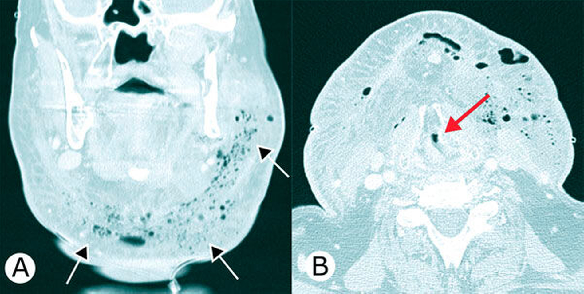 Die Computertomografie zeigte in den Halsweichgeweben beidseits eine ausgedehnte Abszedierung mit Gasbildung und Einengung des Atemwegs (Abbildung 2).