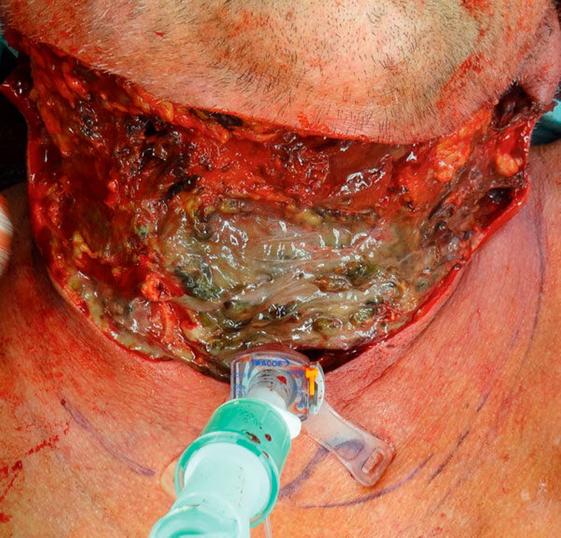Da der Abszess bereits zu einer Sepsis geführt hatte, verblieb der Patient nach der Operation intubiert und beatmet auf der Intensivstation. Trotz intravenöser Antibiose und intensiver Lokaltherapie zeigte sich keine Besserung des Befunds, sodass der Patient noch am selben Tag erneut operiert wurde. Um eine Sicherung der Atemwege zu ermöglichen, wurde eine Tracheotomie durchgeführt. Anschließend wurde die bereits nekrotische Haut des Halses entfernt. Darunterliegend zeigte sich grünlich verfärbtes, nekrotisches Halsweichgewebe, das ebenfalls abgetragen wurde (Abbildung 4). Die Wundfläche wurde zunächst offen gelassen und mit antiseptischen Verbänden bedeckt.