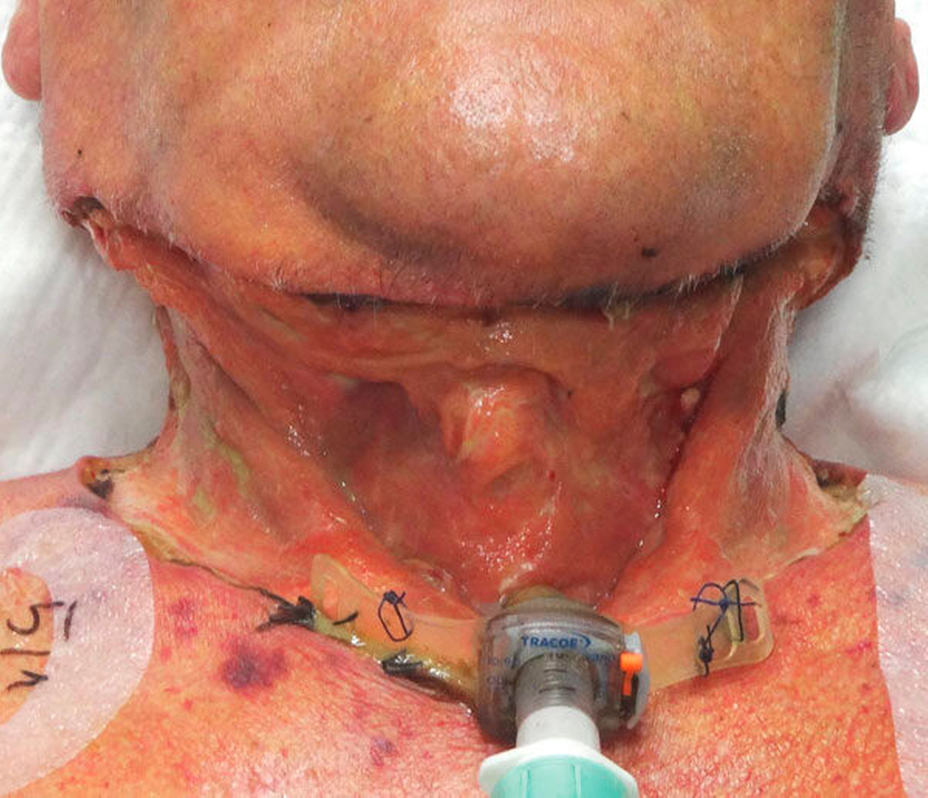 Nach der Ausheilung kann es notwendig sein, entstandene Hautdefekte mittels autologem Gewebetransfer zu versorgen, um Narbenzüge zu verhindern und die tieferliegenden Halsstrukturen zu decken. Hierzu kommen häufig lokale Lappenplastiken, Spalthauttransplantate oder Vollhauttransplantate zum Einsatz. Bei ausgedehnten Defekten mit tiefem Gewebeverlust kann, wie im geschilderten Fall, mit einem mikrovaskulär anastomosierten Transplantat Haut, Unterhaut oder sogar Muskulatur rekonstruiert werden. Das Transplantat wird dabei bewusst überdimensioniert, um die physiologisch eintretende Schrumpfung auszugleichen. Wenn es bereits zum Verlust von Kieferknochen gekommen ist, gelingt es mit dieser mikrochirurgischen Technik auch, Knochen vom Becken, Wadenbein oder Schulterblatt zur Kieferrekonstruktion zu transplantieren.