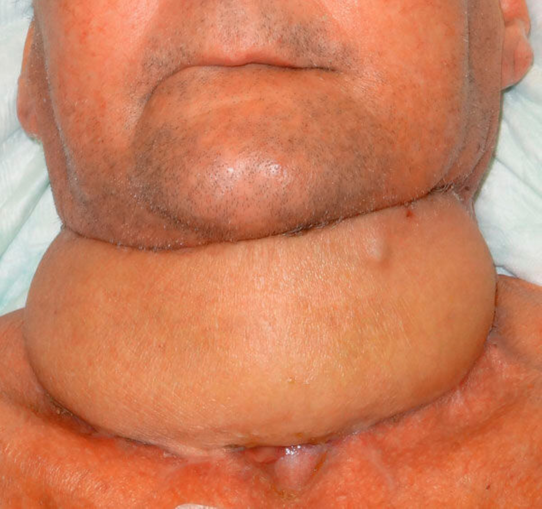 Der Patient wurde umgehend notfallmäßig operiert, wobei die Intubation durch die Atemwegsverlegung nur fiberoptisch möglich war. Zur Fokussanierung wurde eine Totalsanierung mit Entfernung aller Zähne und Wurzelreste durchgeführt. Zudem erfolgten mehrere Abzessinzisionen von extraoral, wobei sich insgesamt 700 Mililiter Pus entleerten. Zur Drainage und Spülung des Abszesses wurden insgesamt zehn Drainagen nach submandibulär, perimandibulär, parapharyneal, submental und supraklaviculär eingebracht (Abbildung 3).