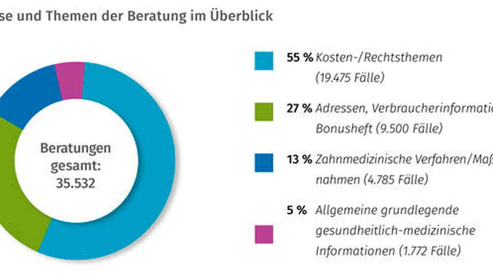 Eine wichtige Rolle im Beratungsgeschehen spielen Anfragen zu Kosten- und Rechtsthemen: Gut die H ä lfte aller Beratungen (55 Prozent) betreffen Kosten- und Rechtsfragen – darunter beispielsweise Geldforderungen, Patientenrechte und zahnärztliche Berufspflichten.