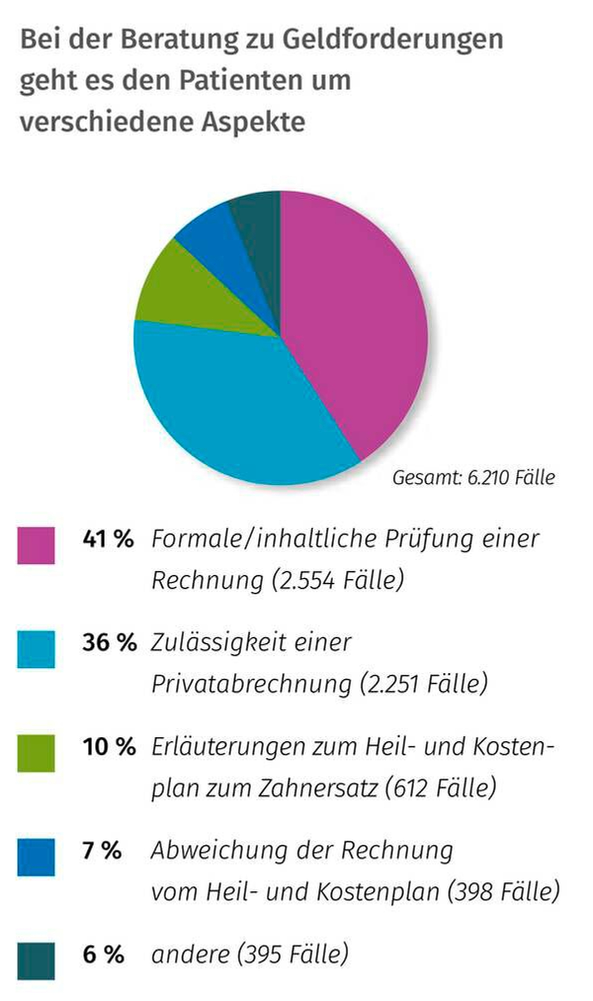 Anders als in anderen medizinischen Versorgungsbereichen handelt es sich bei zahnärztlichen Behandlungen oft um gemischt finanzierte Leistungen mit einem für die Patienten spürbaren privaten Zahlungsanteil. Dementsprechend sind Kostenfragen ein wiederkehrendes und prominentes Thema in der zahnärztlichen Patientenberatung. Dabei führt die Komplexität der Abrechnungsmodalitäten häufig zu einem gesteigerten Informationsbedürfnis – gelegentlich auch zu nachhaltigen Irritationen. Rund 6.200-mal haben sich Ratsuchende an die Patientenberatung gewandt, um zu klären, ob die Rechnung ihres Zahnarztes richtig und rechtmäßig ist, wie sich der Heil- und Kostenplan zum Zahnersatz verstehen lässt oder warum er von der späteren Rechnung des Zahnarztes abweicht.