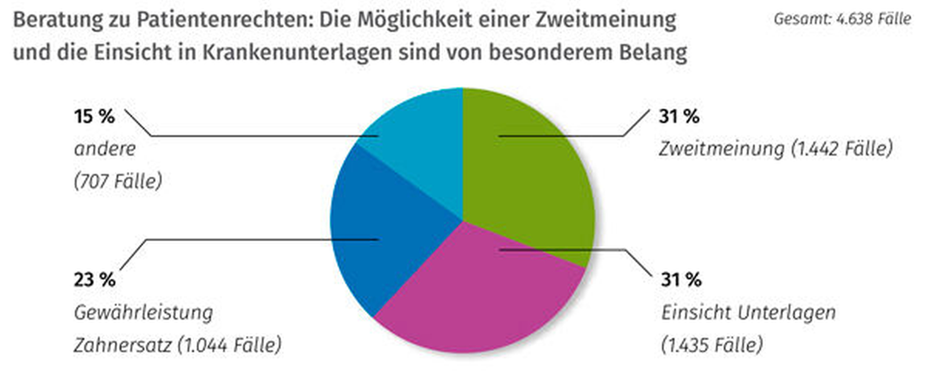 Auch patientenrechtliche Anfragen, etwa zur Möglichkeit einer zweiten Meinung, zum Einsichtsrecht in die eigenen Unterlagen oder zu Gewährleistungsansprüchen, waren mit circa 4.600 Beratungskontakten recht häufig, während Beratungen zu den zahnärztlichen Berufspflichten mit gut 1.100 Kontakten eher weniger ins Gewicht fielen.