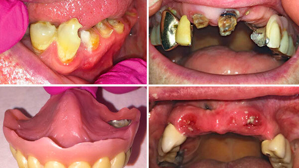 Abgebrochene Zähne, Absplitterungen von Zähnen und Verblendungen oder herausgefallene Füllungen sind häufig die Ursache für scharfe Kanten (oben links). Die linguale unscheinbare spitze Kante am Zahn 34 (oben rechts) hat die schmerzhafte Schnitt-Verletzung der Zungenunterseite verursacht. Der Patient klagte zwar nicht über Schmerzen, nahm aber beim Essen nur noch weiche Kost zu sich und zeigte häufiger eine grimassierende Mimik. Nach Abrunden der Zahnkante verheilte die Zungenverletzung innerhalb von zwei Wochen und der Patient hat wieder normal gegessen.Auch Prothesen müssen auf scharfe Kanten überprüft werden. Die Prothese im Bild unten links zeigt an vielen Randbereichen Absplitterungen, da sie immer wieder unkontrolliert aus dem Mund auf den Boden gefallen ist. Pflegekräften empfehlen wir, bei der Prothesenreinigung bewusst die Prothesenränder und Zähne einmal mit dem Finger abzufahren – mit dem Finger „sieht“ man besser!Druckstellen sind nicht selten und werden nicht immer reklamiert. Die Implantat-Prothese im Bild unten rechts zeigt neben wulstartigen Auftreibungen im Bereich der Prothesenränder zudem Rötungen im Prothesenlagerbereich. Die Pflegekräfte waren unsicher im Umgang mit der Prothese, deshalb wurde die Prothese nicht herausgenommen und deshalb die Prothesenunterseite (siehe kleines Bild) wie auch die entsprechenden Schleimhautareale im Oberkiefer nicht gereinigt (siehe kleines Bild). Die Patientin hat nicht über Schmerzen geklagt und auch sonst keine Anzeichen für Schmerzen gezeigt. Wir begleiten die Pflege nun intensiv bei der Handhabung und überprüfen engmaschig, ob die Schleimhaut sich wieder normalisiert. | Elmar Ludwig