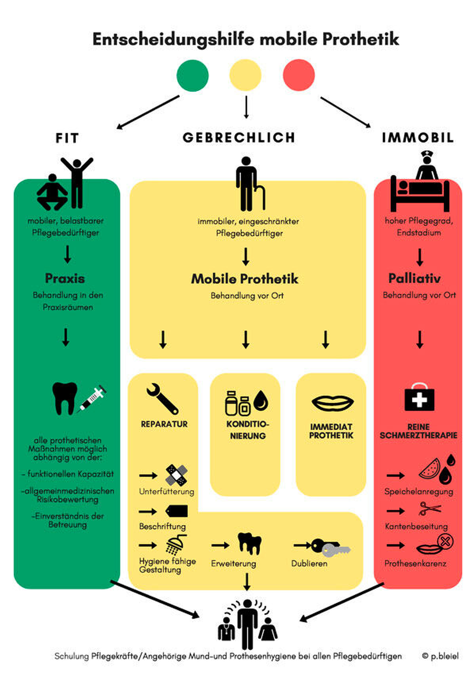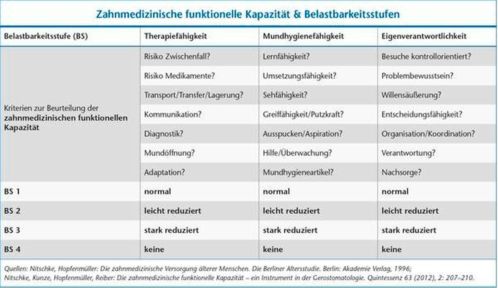 Zur Orientierung in Bezug auf Art und Umfang der Behandlung hat sich die „zahnmedizinische funktionelle Kapazität“ bewährt [Nitschke, 1996]. Aus den Kriterien Therapiefähigkeit, Mundhygienefähigkeit und Eigenverantwortlichkeit ergibt sich für jeden Patienten eine sogenannte Belastbarkeitsstufe (Abbildung 1). Diese kann unter anderem hilfreich sein, im Gespräch mit Patienten, gesetzlichen Vertretern oder Angehörigen, die Therapieoptionen abzuwägen. Die Klärung der zahnärztlichen Betreuung (Versorgungsdiagnose) sowie die Fragen zur Durchführung der täglichen Mundhygiene (Nachsorgekompetenz) werden hier ebenfalls einbezogen. Abgeleitet von den Belastbarkeitsstufen ist beispielsweise die „Entscheidungshilfe mobile Prothetik“ ein nützliches Praxistool, das die Praxis Bleiel aus Rheinbreitenbach entwickelt hat [Bleiel, 2012] (Abbildung 2).