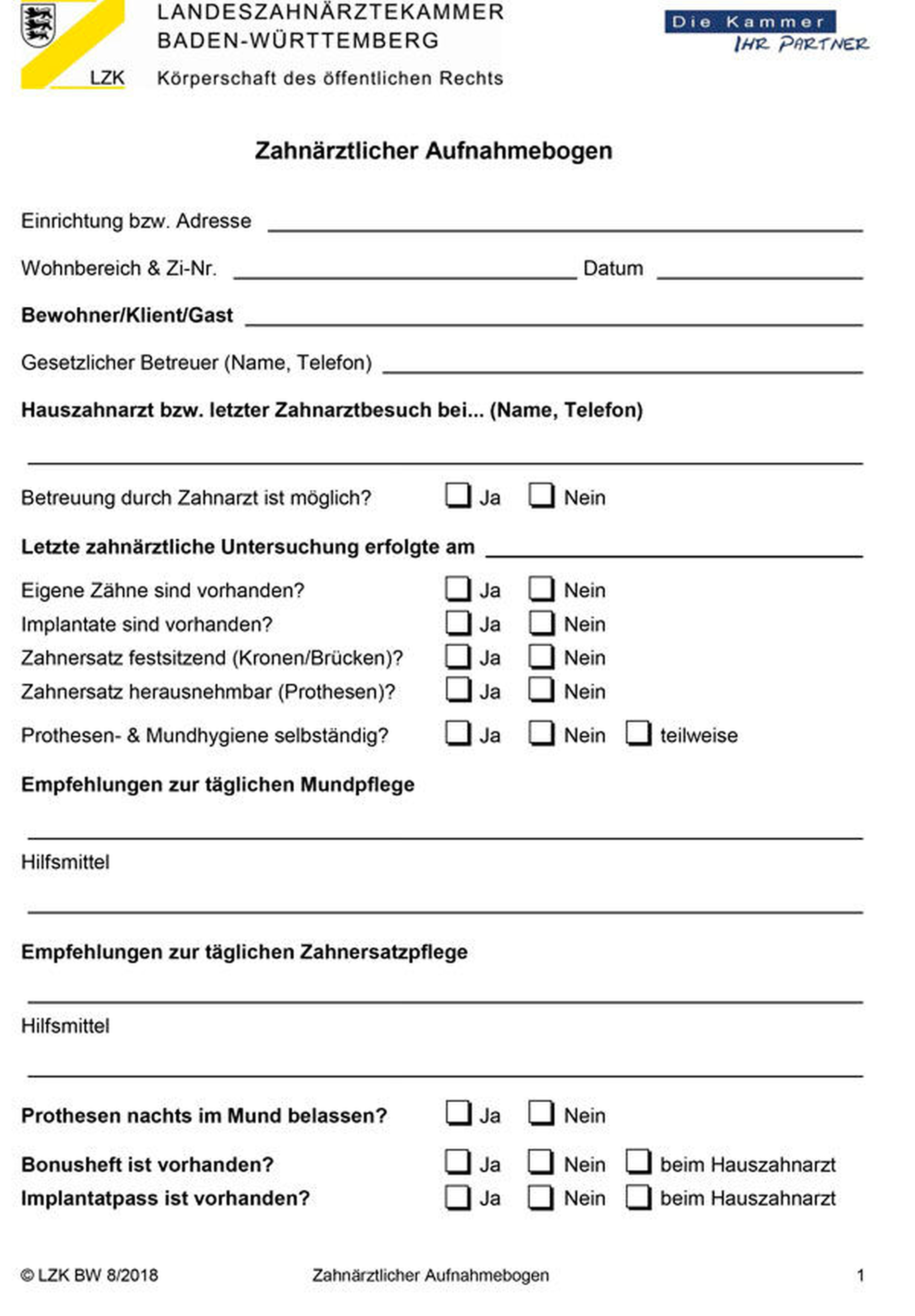 Um die Nachsorgekompetenz noch besser fördern zu können hat die Landeszahnärztekammer (LZK) Baden-Württemberg einen zahnärztlichen Aufnahmebogen entwickelt. Ist dieser Bogen in die Aufnahmemappe der Pflegeeinrichtung integriert, werden von Anfang an auf einer Seite alle relevanten Informationen unter anderem zum Hauszahnarzt, zu gewohnten Pflegemitteln oder zum Bonusheft eingeholt. Sollen wir als Kooperationszahnarzt die Betreuung übernehmen, kann ein Gespräch mit dem bisherigen Hauszahnarzt weitere wichtige Informationen zutage fördern und es können gegebenenfalls vorhandene Röntgenaufnahmen übermittelt werden. Auch wenn in der Vergangenheit immer wieder bei Aufnahme eines Bewohners in eine Pflegeeinrichtung keine entsprechenden Informationen mehr verfügbar waren, so macht es doch Sinn, diese Informationen abzufragen, nicht zuletzt weil die Mundgesundheit immer mehr ins Bewusstsein der Bevölkerung rückt (Abbildung 3).