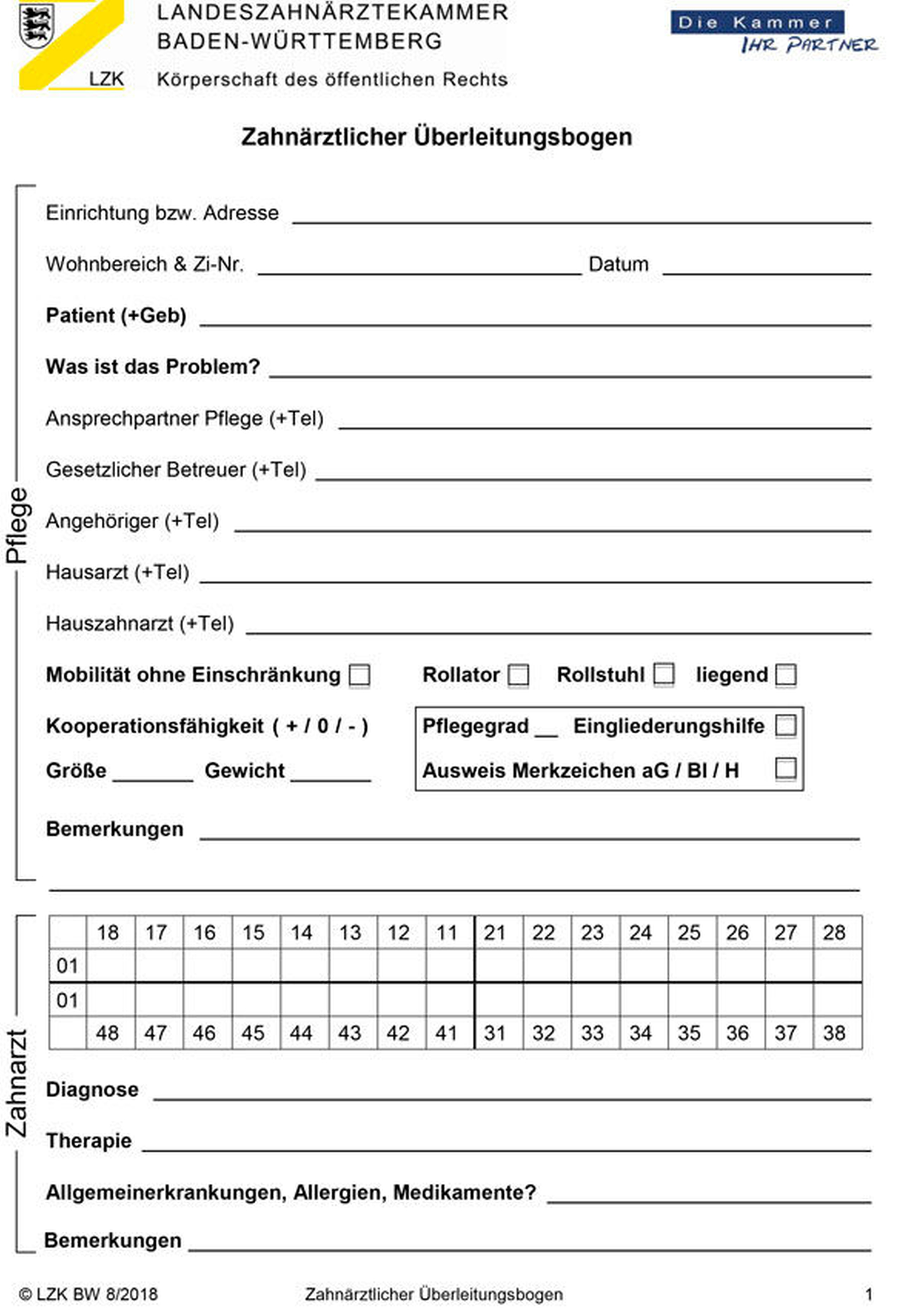 Ein zweites Formular, der ebenfalls von der LZK Baden-Württemberg entwickelte zahnärztliche Überleitungsbogen, kommt zum Einsatz, wenn ein konkreter Behandlungsbedarf auffällt. Sei es, dass das Zahnfleisch gerötet oder eine Schwellung aufgetreten ist, Zähne abgebrochen sind, Prothesen nicht mehr getragen werden, Prothesen nicht mehr halten oder Prothesen gebrochen sind. Viele Pflegeeinrichtungen haben zwar Überleitungsbögen, diese sind aber in der Regel für die Aufnahme in ein Krankenhaus konzipiert und deshalb sehr umfangreich. Werden diese Bögen in die Praxis gefaxt, bedeutet das viel unnötige Information auf vielen Seiten Papier. Wir aber wollen alle für uns wichtigen Informationen möglichst auf einer Seite in die Praxis gefaxt bekommen. Über einen kurzen Rückruf machen wir uns ein Bild von der Dringlichkeit und stimmen den Besuchstermin ab (Abbildung 4).