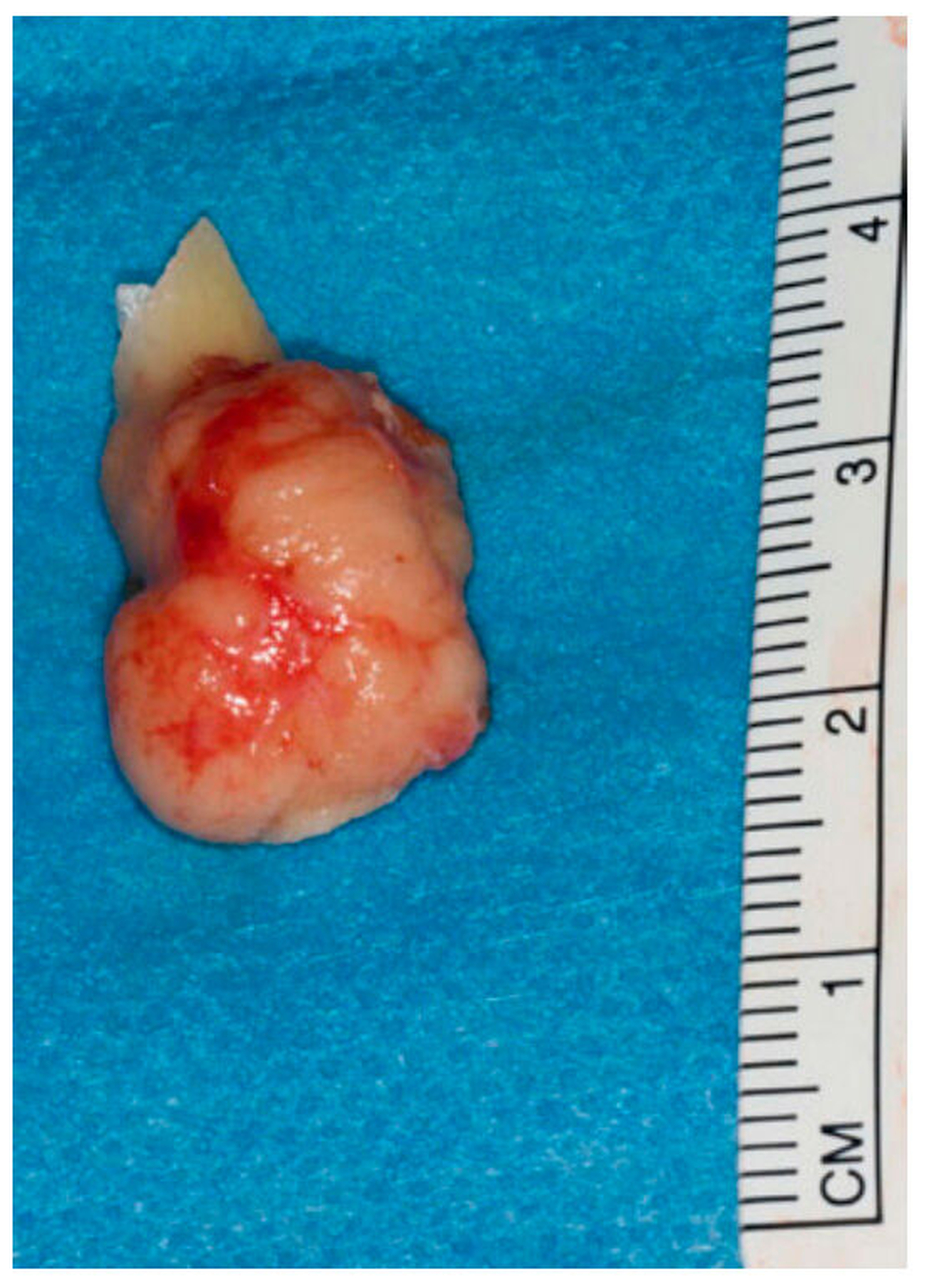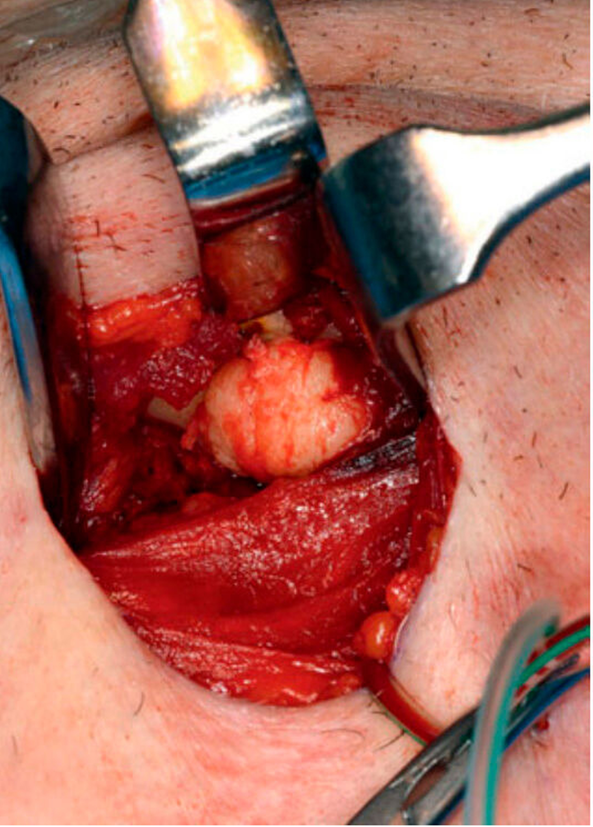 Zur histologischen Sicherung wurde die Läsion in Intubationsnarkose in toto über einen extraoralen Zugang entfernt. Der Situs präsentierte sich hierbei mit einem vom physiologischen Knochen morphologisch gut abgrenzbaren spongiös anmutenden Befund (Abbildung 2). Dieser wurde piezochirurgisch entfernt und an die Pathologie gesandt (Abbildung 3). Die histopathologische Aufbereitung bestätigte das Vorliegen eines Osteoms. Ein Anhalt für Malignität bestand nicht. In der Nachsorge zeigten sich keine Auffälligkeiten. Die weitere ambulante Nachsorge ließ der Patient dann heimatnah vornehmen.