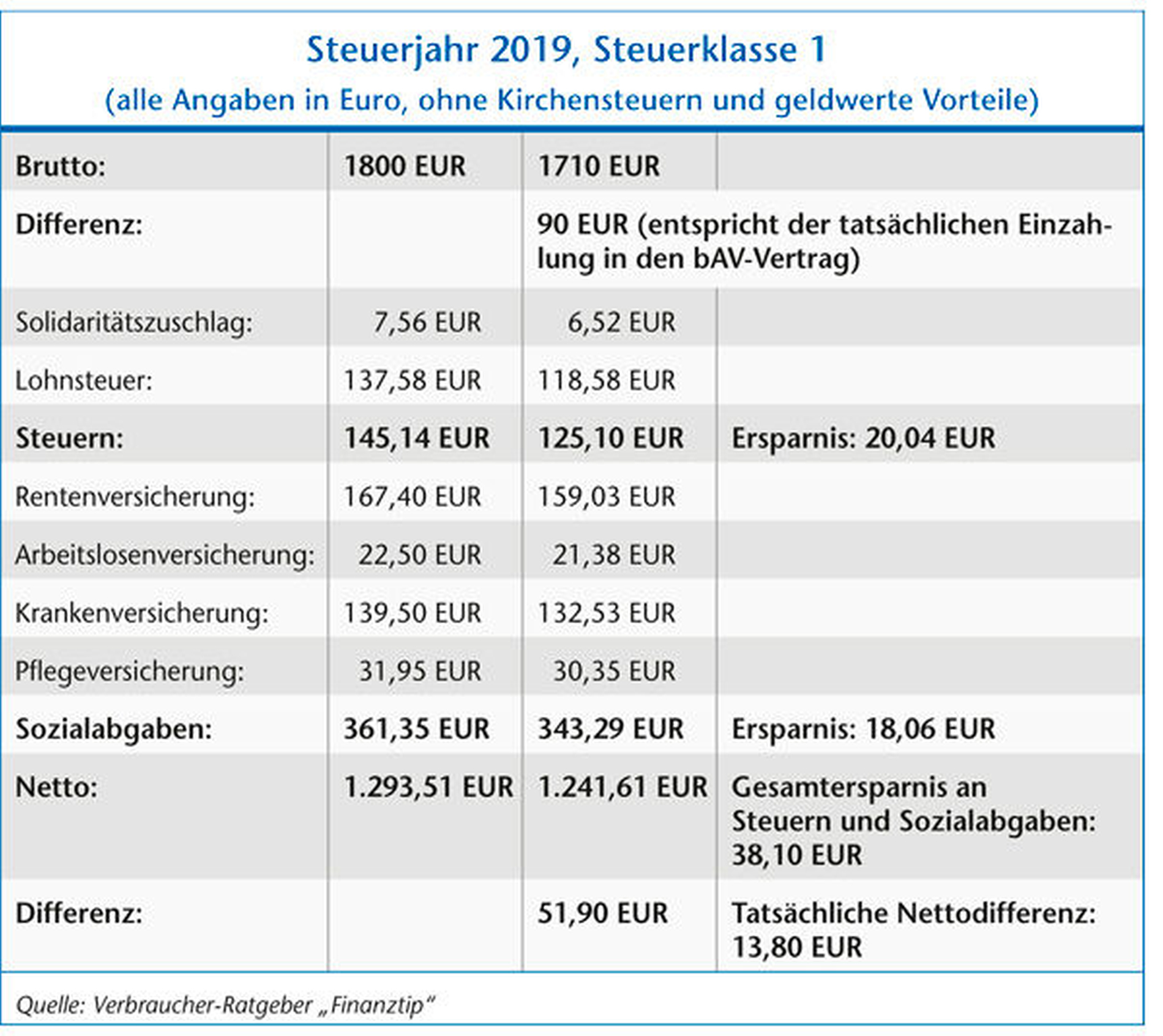 Der Mitarbeiter zahlt Teile seines Lohns oder Gehalts in einen bAV-Vertrag ein. Der Beitrag wird vom Bruttoentgelt in den Vertrag gebucht, Steuern und Sozialabgaben sind nur auf das verbliebene Bruttogehalt zu zahlen (siehe Tabelle mit Rechenbeispiel für eine ZFA).