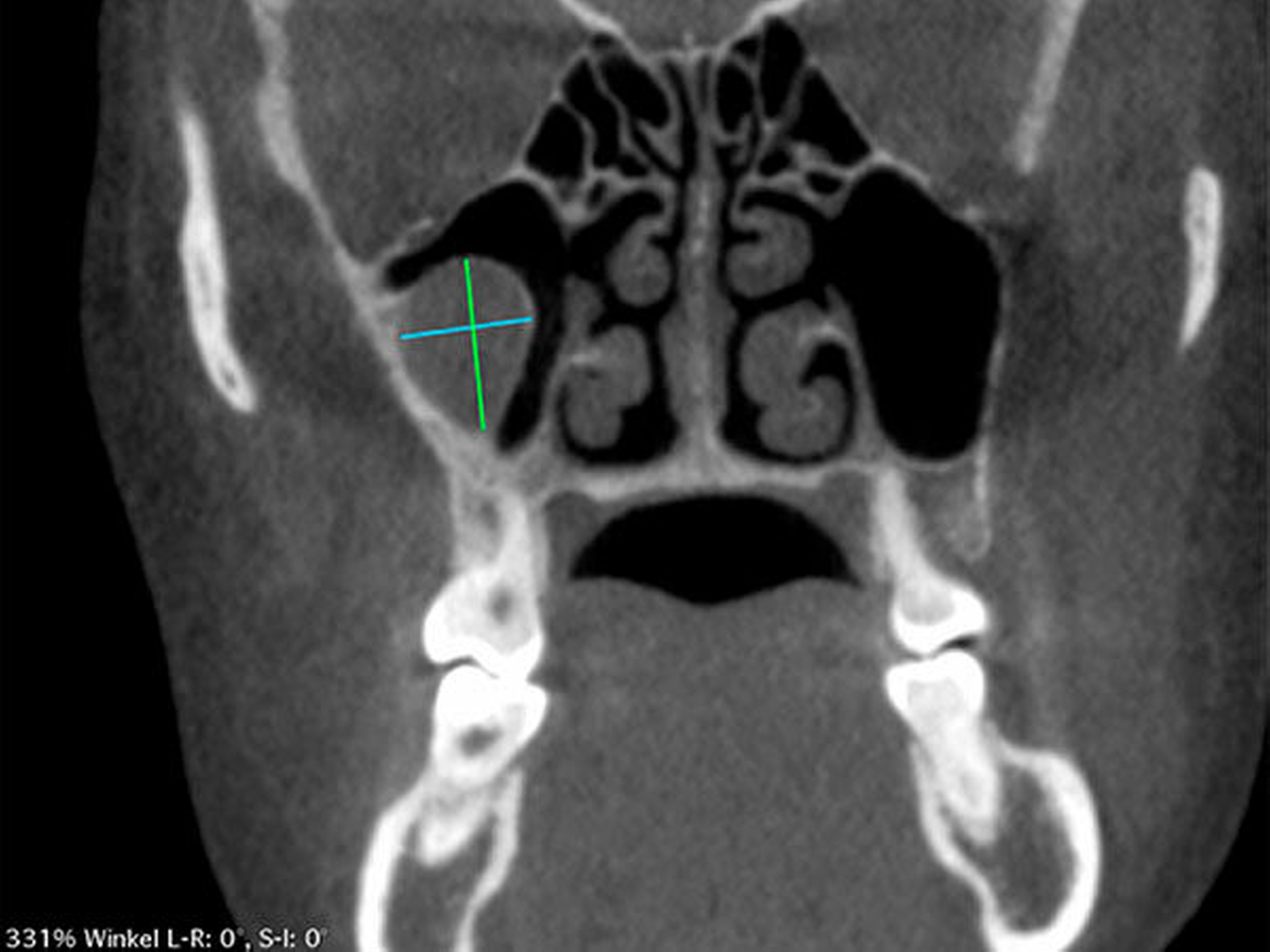 Auf Nachfrage berichtete die Patientin von seit Monaten wiederkehrenden Episoden sinusitischer Beschwerden mit dem Gefühl einer Drucksteigerung im Bereich der rechten Nasennebenhöhle beim Vornüberbeugen des Kopfes sowie einer eingeschränkten Nasenatmung rechts. Bei der klinischen Untersuchung zeigten sich sämtliche Zähne im ersten Quadranten vital, was die initiale Verdachtsdiagnose einer radikulären Zyste formal unwahrscheinlich machte.