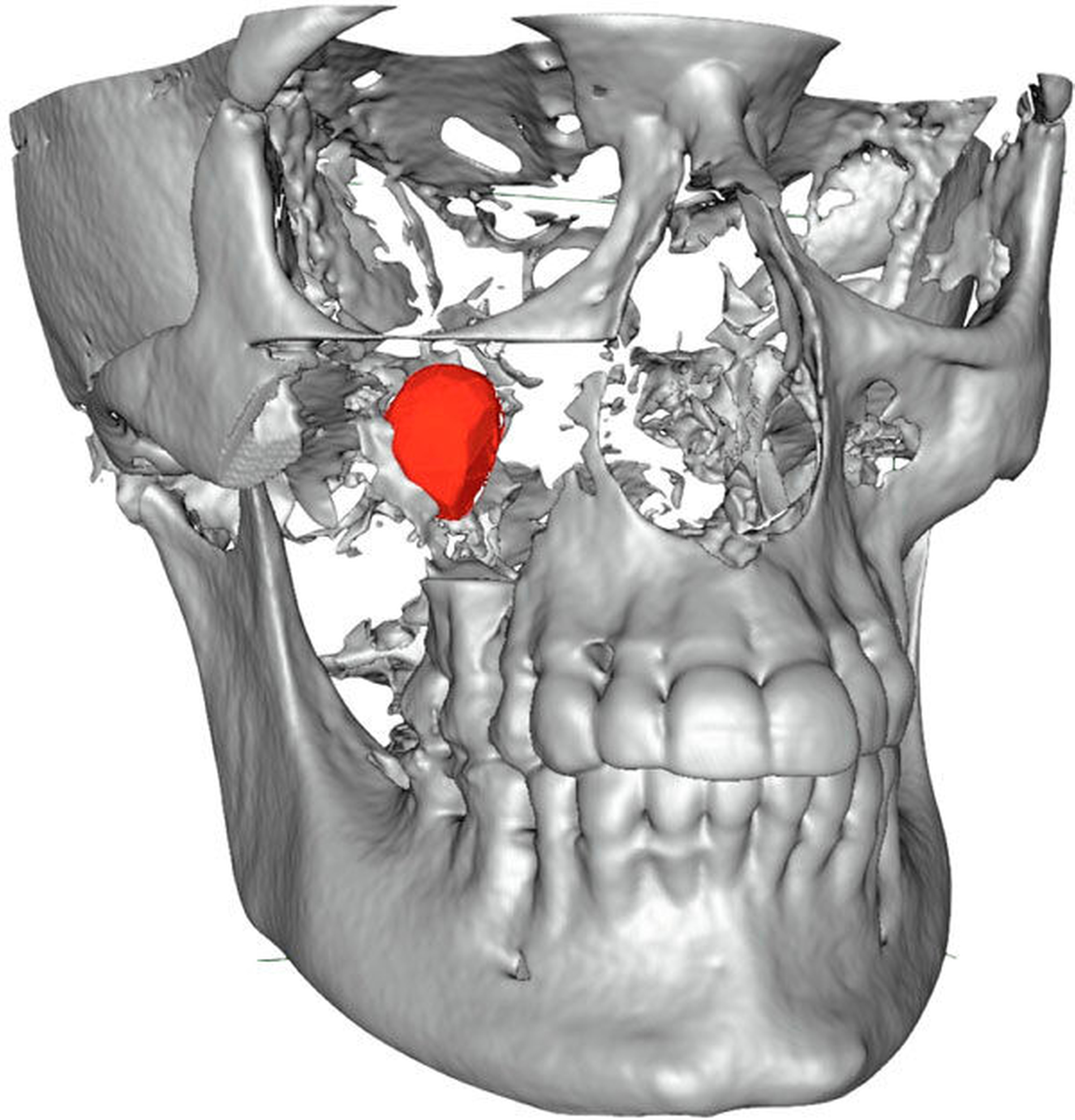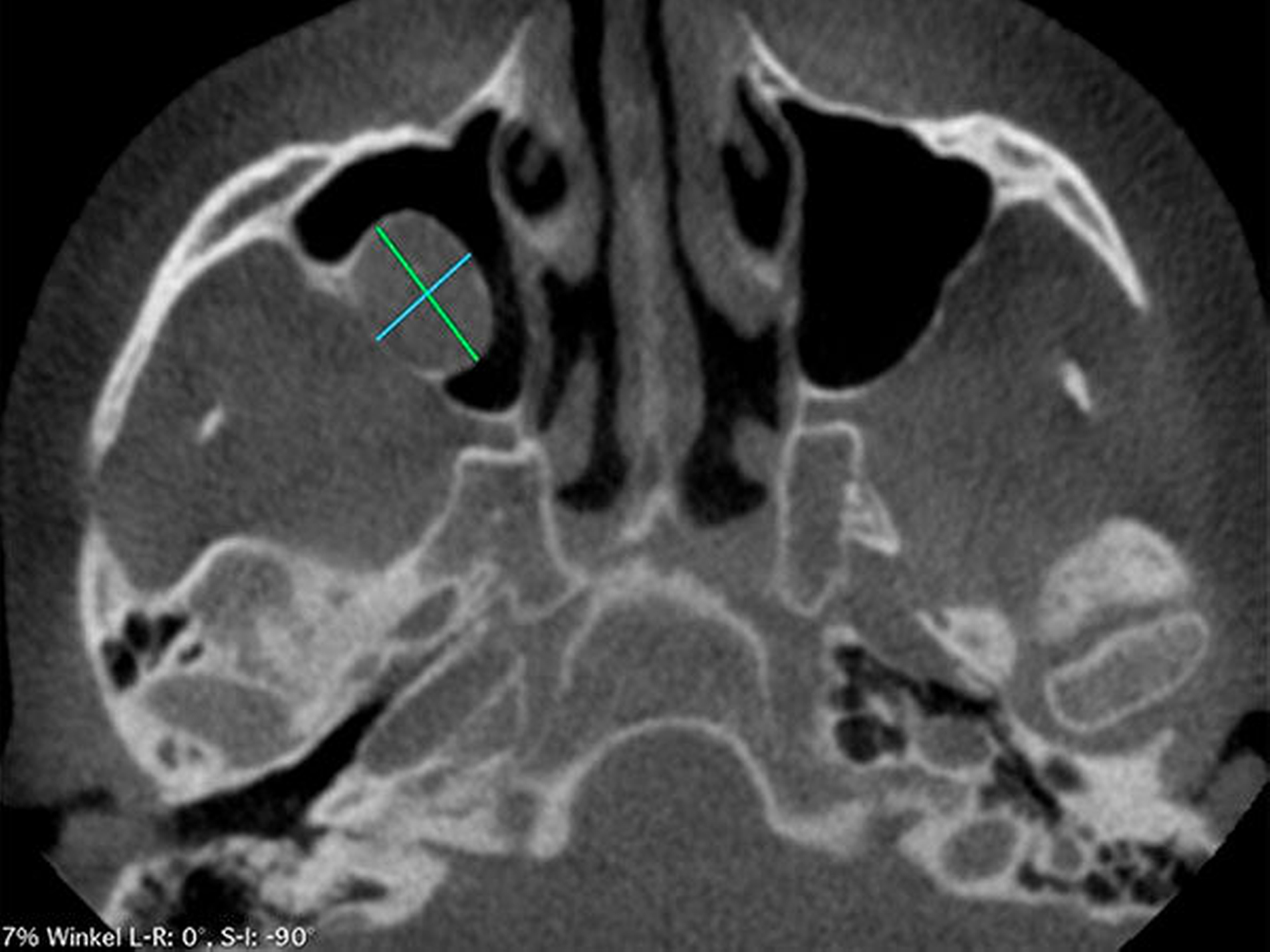 Die Durchführung einer digitalen Volumentomografie (DVT) zeigte die dreidimensionale Ausdehnung der eiförmigen Raumforderung mit einem Volumen von 2,34 cm3 (Abbildung 2).