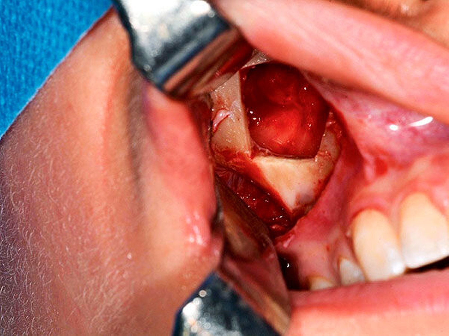 Anfang November erfolgte in Absprache und auf Wunsch der Patientin die operative Befundentfernung im Sinne einer diagnostischen transoralen Antrozystektomie in Intubationsnarkose. Nach paramarginaler Schnittführung und maxillärer Fensterung stellte sich der oben beschriebene Befund in situ als septierte, prall-elastische Raumforderung mit rötlichem Kolorit dar (Abbildung 3a). Nach der vollständigen endoskopisch-gestützten Exstirpation (Abbildung 3b) präsentierte sich das makroskopische Präparat als bräunlich-graue, solide Masse, umgeben von einer für Zysten typischen Bindegewebskapsel (Abbildung 3c), was in Zusammenschau mit der positiven Vitalitätstestung am ehesten die Verdachtsdiagnose einer odontogenen Keratozyste unterstützte. Nach sorgfältiger Spülung der Kieferhöhle wurde der entnommene Knochendeckel unter Verwendung von zwei Miniosteosyntheseplatten belastungsstabil re-inseriert und das Weichgewebe mittels Naht verschlossen (Abbildung 3d).