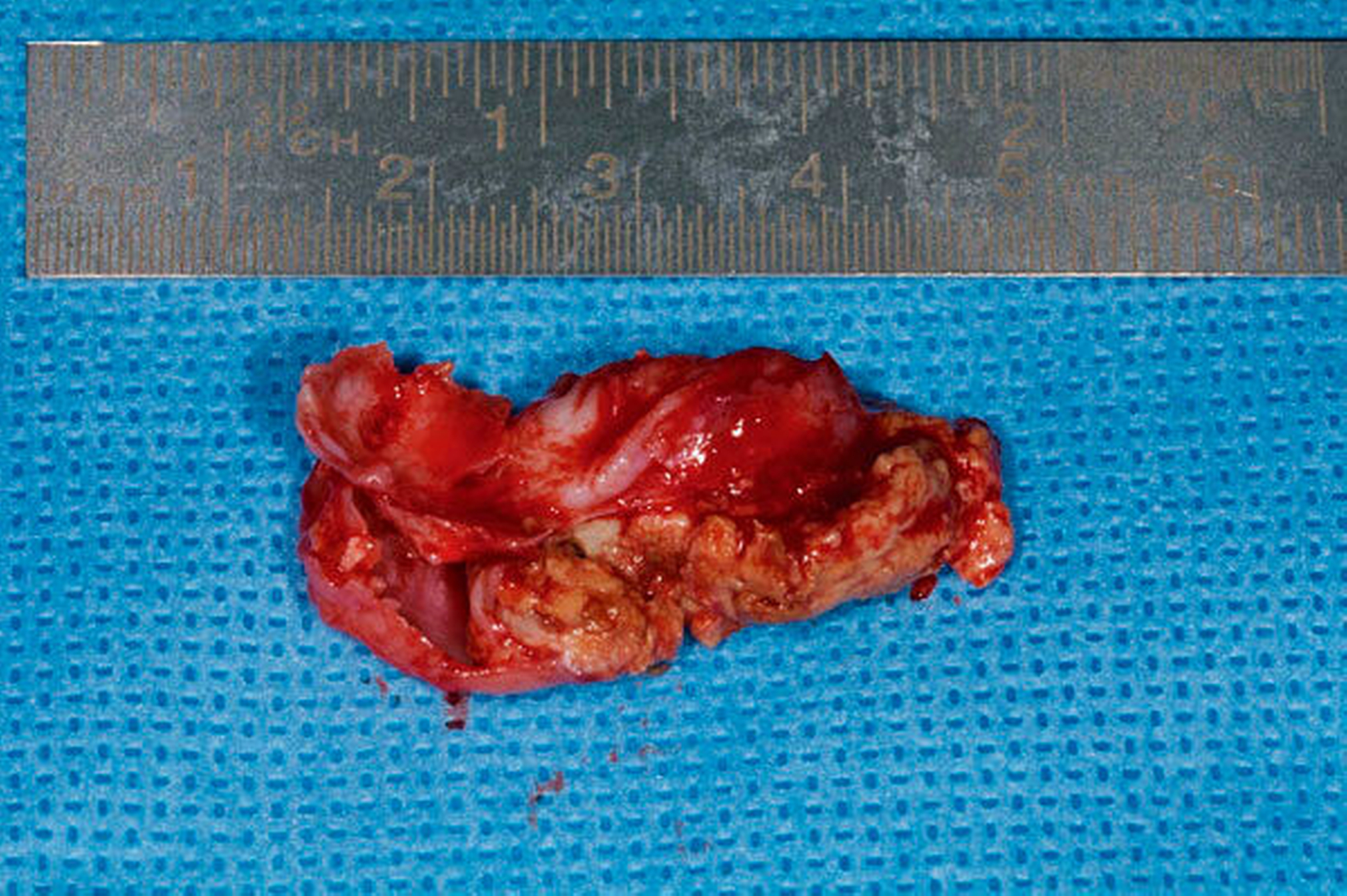 Das Ergebnis der histopathologischen Nachuntersuchung bestätigte den intraoperativen Verdacht einer odontogenen Keratozyste (Abbildung 4). Während der Nachsorge zeigte sich die Wundheilung reizlos und zeitgerecht. Zur Rezidivprophylaxe wurde ein regelmäßiges Nachsorgeintervall von zwölf Monaten festgelegt.