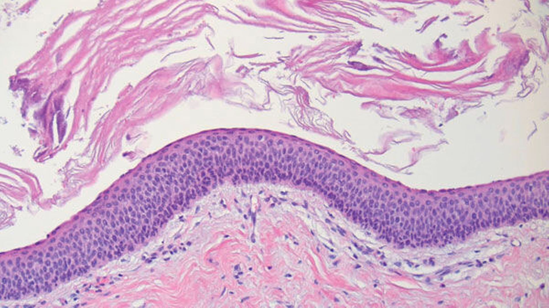 Histopathologisch zeichnet sich die odontogene Keratozyste durch eine regelmäßige Schichtung (sechs bis acht Zelllagen) plattenepithelialer Zellen ohne Reteleisten aus. Neben einer oberflächlichen Keratinschicht erscheinen die Basalzellen häufig kubisch-hyperchromatisch mit palisadenförmiger Anordnung [Soluk-Tekkesin und Wright, 2013]. Die luminale Oberfläche weist meist ein gewellt parakeratotisches Epithel auf (Abbildung 4). Aufgrund der symptomarmen Klinik handelt es sich bei den meisten odontogenen Keratozysten um Zufallsbefunde, die meist im Rahmen zahnärztlich-radiologischer Routineuntersuchungen manifest werden [Shear, 2003]. Bei erheblicher Volumenzunahme können Schmerzen in Verbindung mit sekundären Infektionen des Zysteninhalts sowie Schwellungen und Fistelungen auftreten. Die angrenzenden Zähne sind meist vital, hier zeigen sich eher Zahnverlagerungen als Zahnresorptionen [Yang et al., 2011].