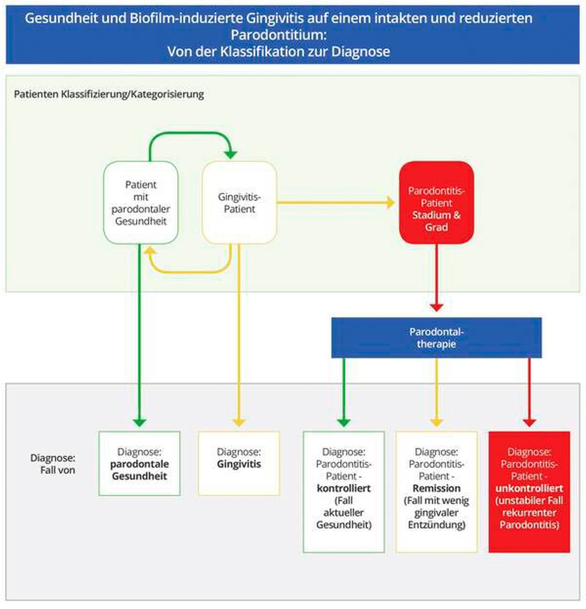 Es wurde daher vereinbart, dass nach der Diagnose einer Parodontitis ein Patient lebenslang ein Parodontitis-Patient bleibt, dessen Status nach erfolgreicher Therapie jederzeit in eine der drei Kategorien eingeteilt werden kann: