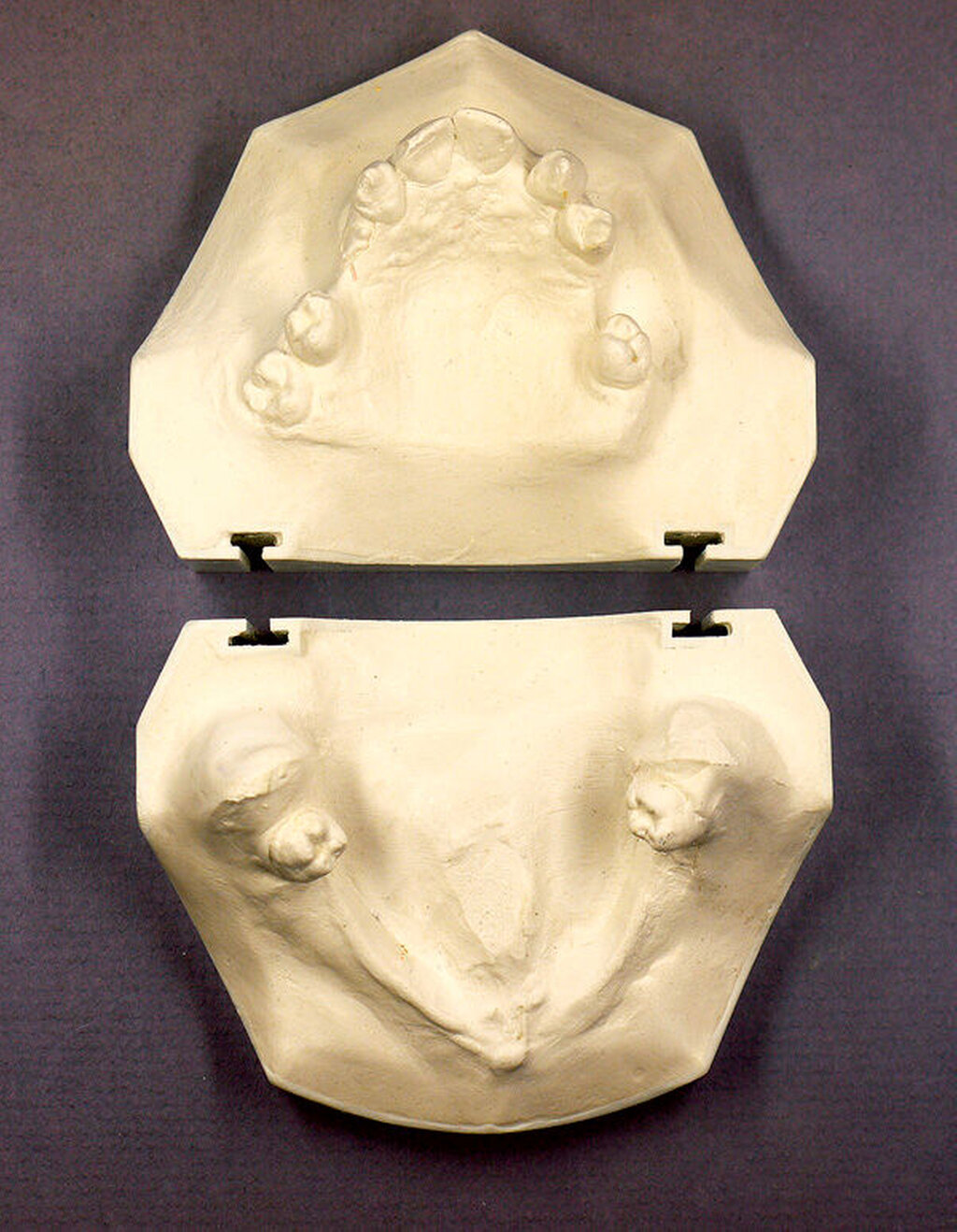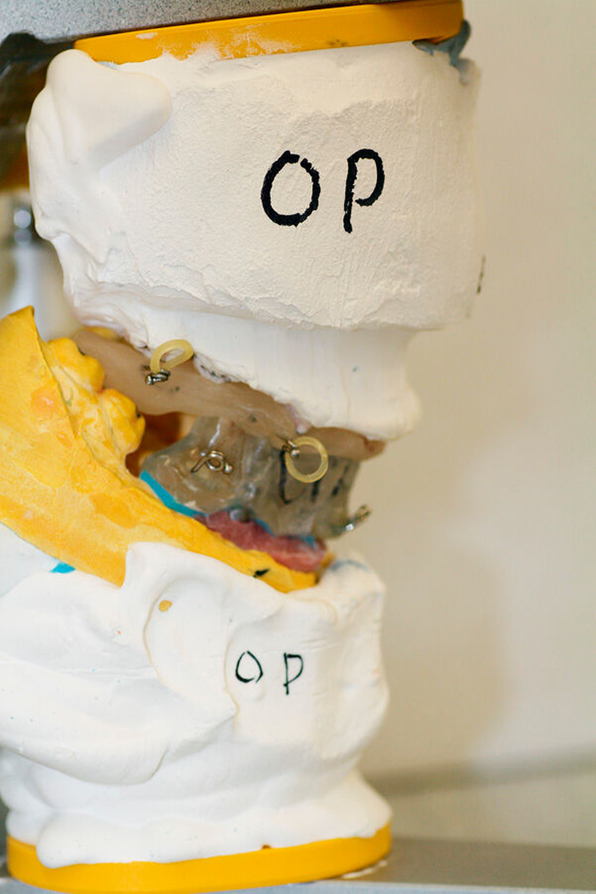 Anschließend wurde eine bimaxilläre Umstellungsoperation (in der Le-Fort-I-Ebene und nach Obwegeser/Dal Pont) durchgeführt (Abbildung 5). Hierfür wurde für den OP-Splint eine provisorische Implantat-getragene Prothese im Unterkiefer angefertigt, so dass die Implantate letztlich auch zur Eingliederung des OP-Splints dienten (Abbildungen 6 und 7). Zusätzlich konnte postoperativ durch die Implantat-getragene Prothese die Okklusion gesichert und das Risiko eines Rezidivs im Sinne einer Okklusionsverschiebung minimiert werden [Ohba et al., 2015].