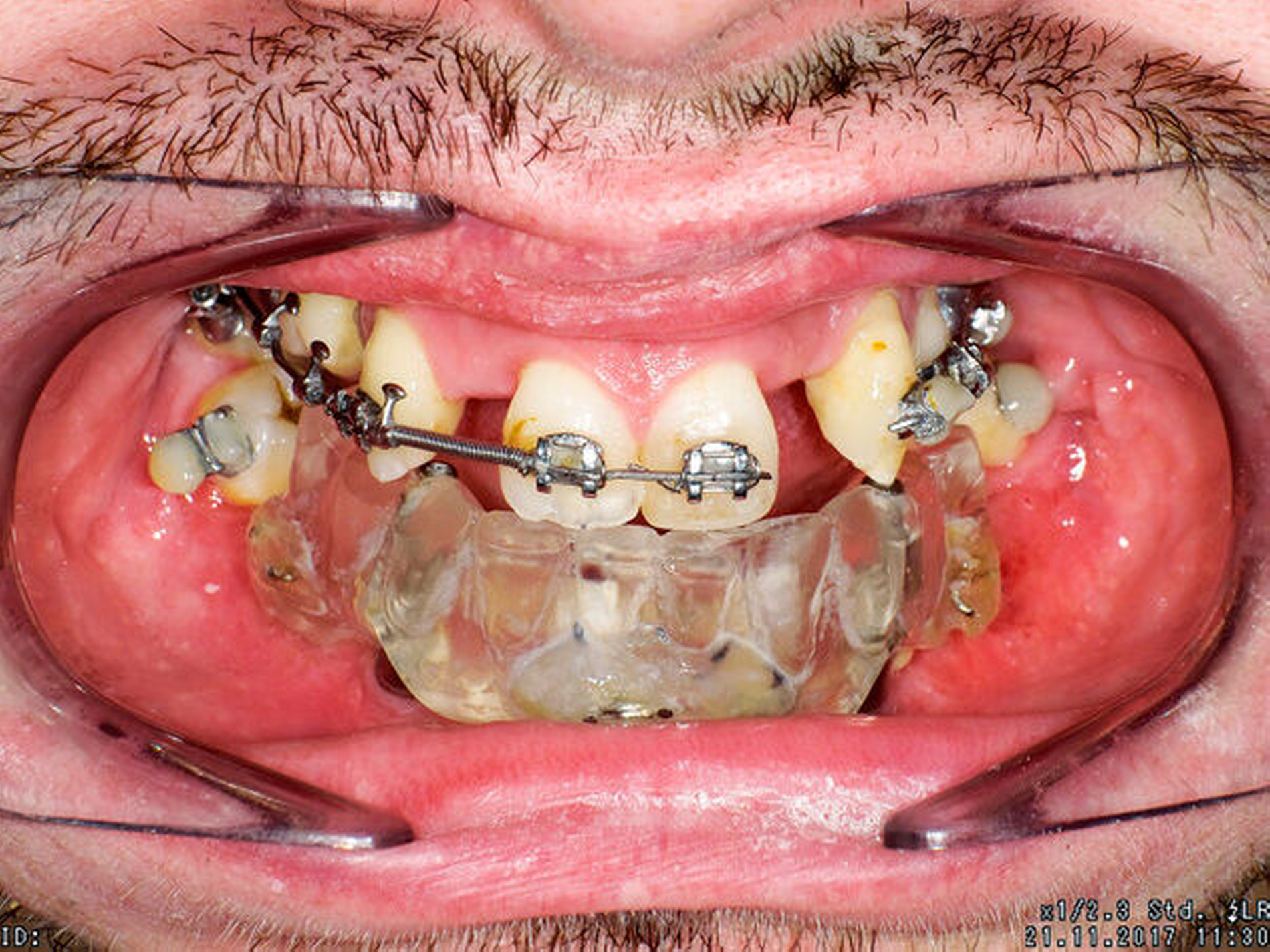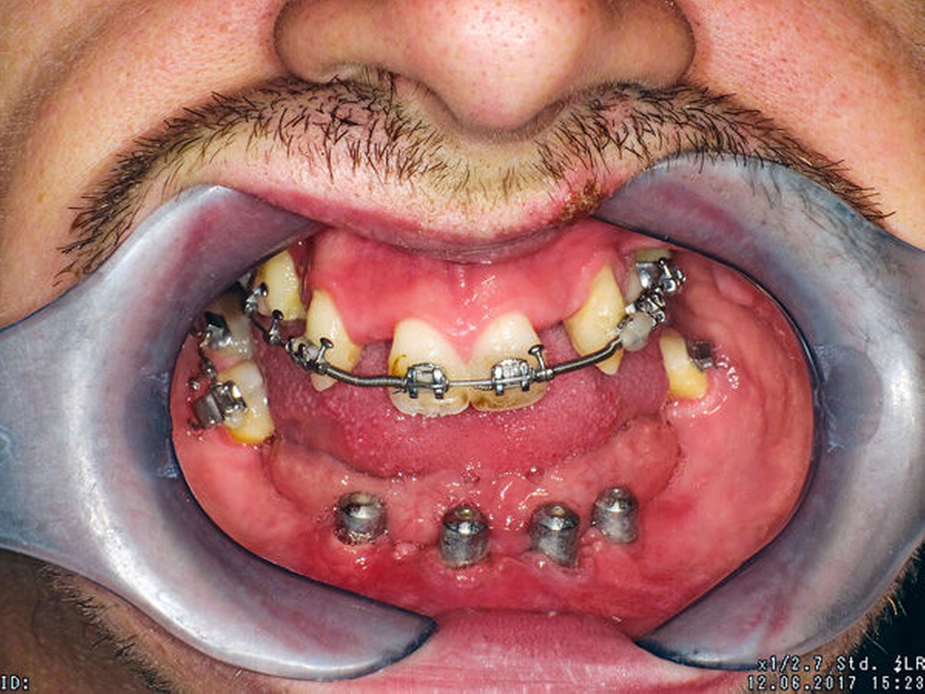 Zu Therapiebeginn im Alter von 20 Jahren zeigte sich eine skelettale Klasse III mit transversaler, vertikaler und sagittaler Unterentwicklung der Maxilla. Im Oberkiefer war die Zahnanzahl deutlich reduziert. Der Unterkiefer war nahezu zahnlos, hier waren außerdem der Alveolarfortsatz und die attached Gingiva stark atrophiert (Abbildungen 1 bis 3).