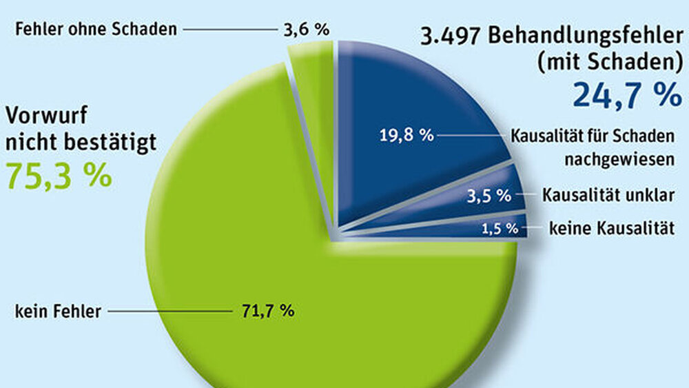 13 Prozent aller Vorwürfe betrafen die Innere Medizin und Allgemeinmedizin (1.792 Fälle), 9 Prozent die Allgemein- und Viszeralchirurgie (1.315 Fälle), ebenfalls 9 Prozent (1.231 Fälle) die Frauenheilkunde und Geburtshilfe, 8 Prozent die Zahnmedizin, inklusive Oralchirurgie und Kieferorthopädie (1.109 Fälle) und 5 Prozent die Pflege (794 Fälle).
