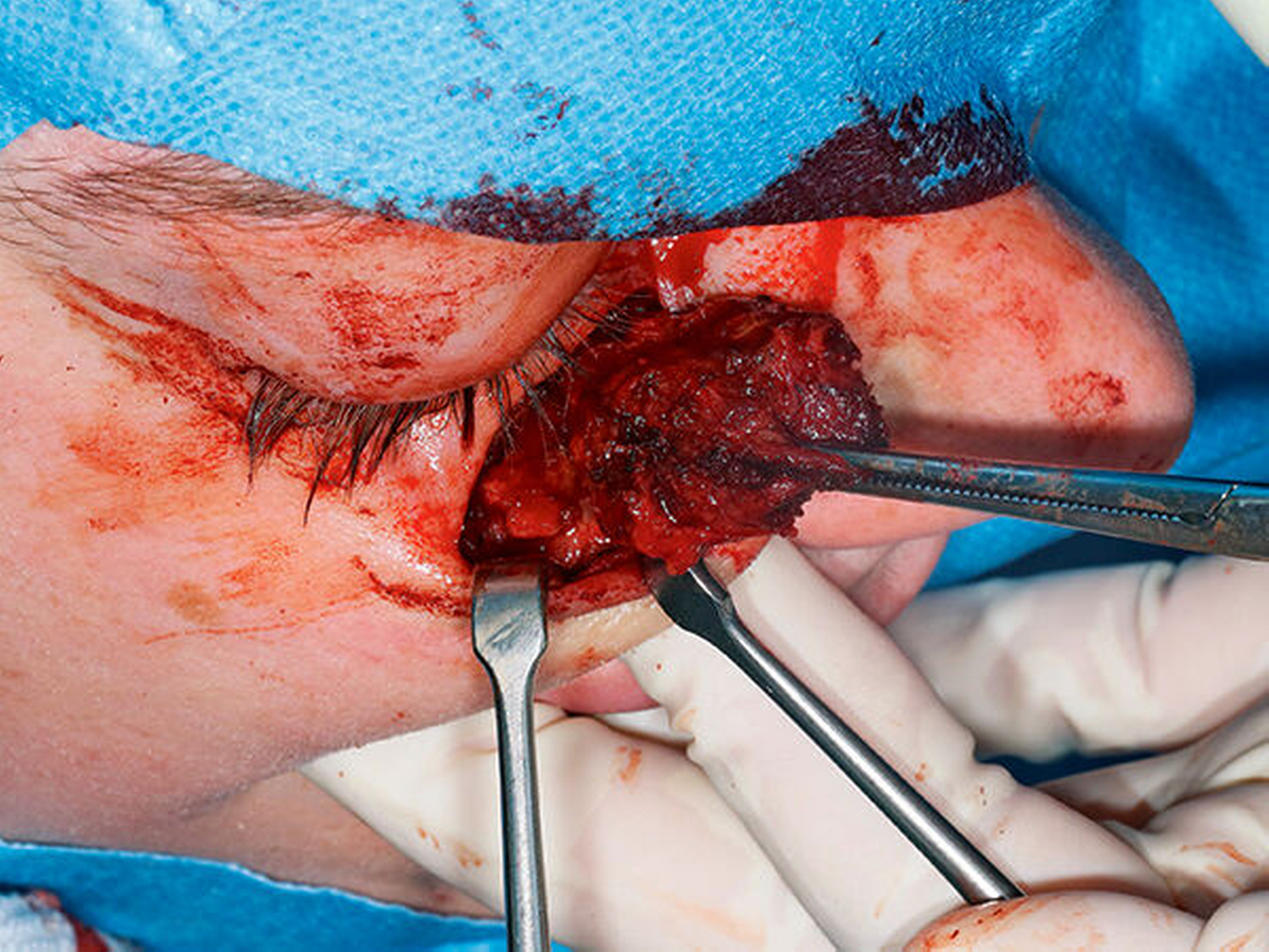 Der inzwischen 23-jährige Patient stellte sich mit der seit seiner Kindheit gering größenprogredienten Schwellung der rechten Wange in der Klinik für Mund-, Kiefer- und Gesichtschirurgie Mainz vor (Abbildung 1). Der bereits kongenital vorliegende Befund hatte sich in den vorherigen Biopsien histologisch als Lymphangiom herausgestellt. Aufgrund der – vorrangig optischen – Beeinträchtigung ohne Amblyopiegefahr waren schon früh eine Laserbehandlung des Befunds sowie – zwei Jahre vor der aktuellen Vorstellung – eine lokale Therapie mittels Imeron-verdünnter Belomycinlösung erfolgt. Klinisch stellte sich die Raumforderung als derber, indolenter Tumor ohne Pulsation und ohne sensible oder motorische Beeinträchtigung dar. Es zeigten sich weder Visuseinschränkungen noch Augenbewegungsstörungen. Aufgrund der optischen Veränderung der rechten Wange mit deutlich ästhetischem Defizit und hohem subjektivem Leidensdruck erfolgte die elektive Vorstellung zur operativen Therapie.