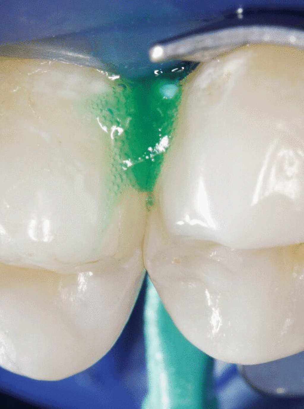 Bisher gibt es ein Produkt zur Kariesinfiltration (Icon, DMG, Hamburg), das alle relevanten Agenzien (HCl-Gel 15 Prozent, Ethanol 99 Prozent und Infiltrant) und ein Keilchen zur Separation enthält. Allerdings sollte vor der Behandlung nach dem Legen von Kofferdam und der Verwendung des Keilchens unbedingt mittels Sondierung [Paris et al., 2019] nochmals darauf geachtet werden, dass nicht versehentlich eine kavitierte Läsion behandelt wird, da selbst Mikrokavitationen nur unzureichend mit dem Infiltranten aufgefüllt werden können und somit die Läsion nur unzureichend arretiert bleibt.