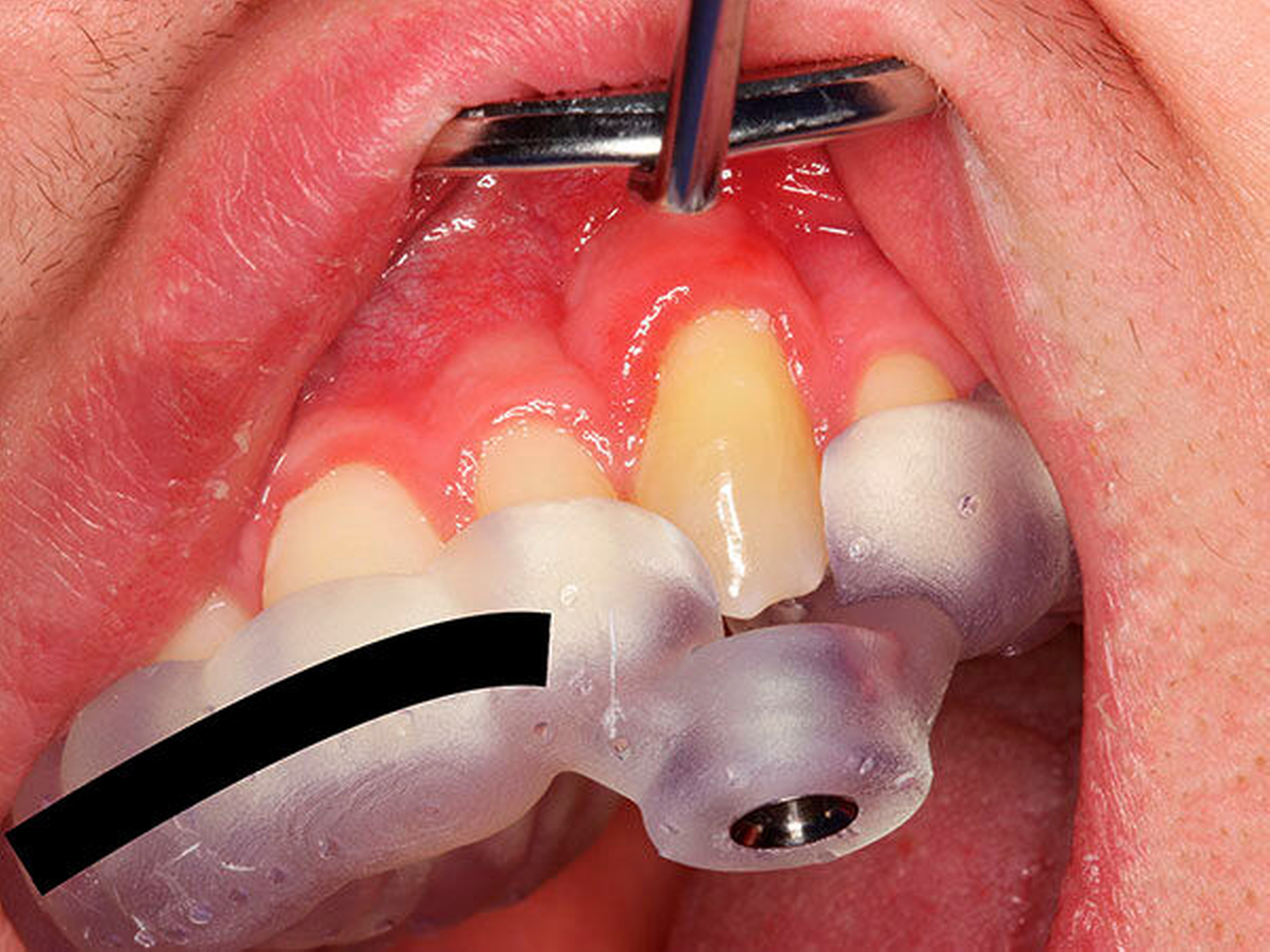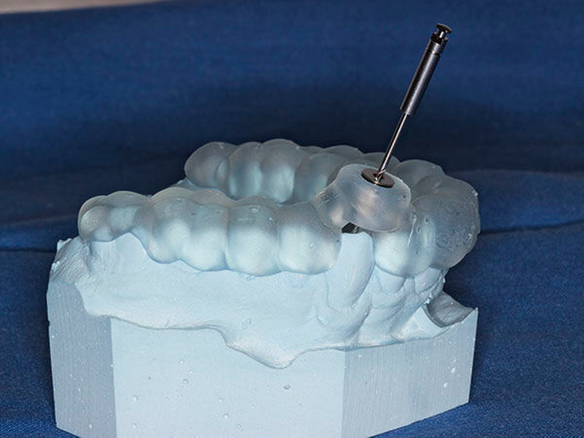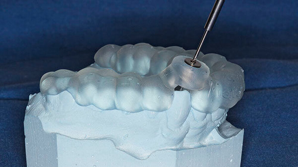Zunächst wurde hierfür eine DVT–Aufnahme mit einem FOV von 8 cm x 8 cm angefertigt (Orthophos XG 3D, Sirona, Bensheim) und das Oberkiefer-Modell des Patienten gescannt (3Series Dentaler Modellscanner, Dental Wings, Montreal, Kanada). Die DICOM- und SLT-Datensätze wurden anschließend in die Planungssoftware (coDiagnostiX, Dental Wings, Montreal, Kanada) übertragen, fusioniert, und es wurde virtuell eine optimale Zugangskavität geplant. Der verwendete Endoseal-Bohrer (Atec Dental, Ebringen) mit einem Durchmesser von 1,0 mm sowie die auf den Bohrer abgestimmte Endo-Guide-Innenhülse (Steco Systemtechnik, Hamburg) sind in der Software hinterlegt. Bohrer und Hülse werden in der Software so positioniert, dass die Zugangskavität bis in die apikalen Kanalabschnitte erfolgen kann (Abbildungen 5 bis 7). Nach der virtuellen Planung (Abbildung 8) erfolgte die Herstellung der Navigationsschiene mit dem 3-D-Drucker Form 2 (Formlabs, Berlin). Im Anschluss wurde die Hülse in die Schiene eingesetzt (Abbildung 9).