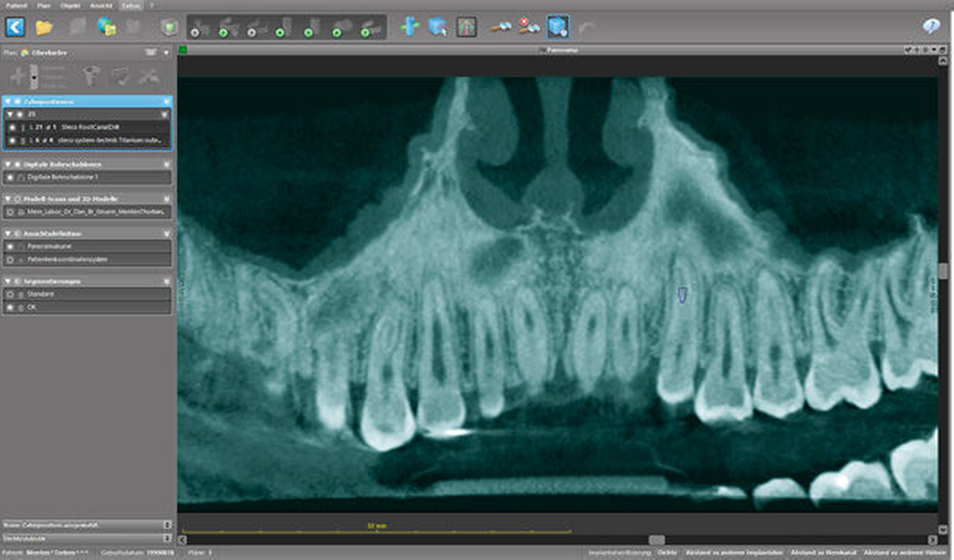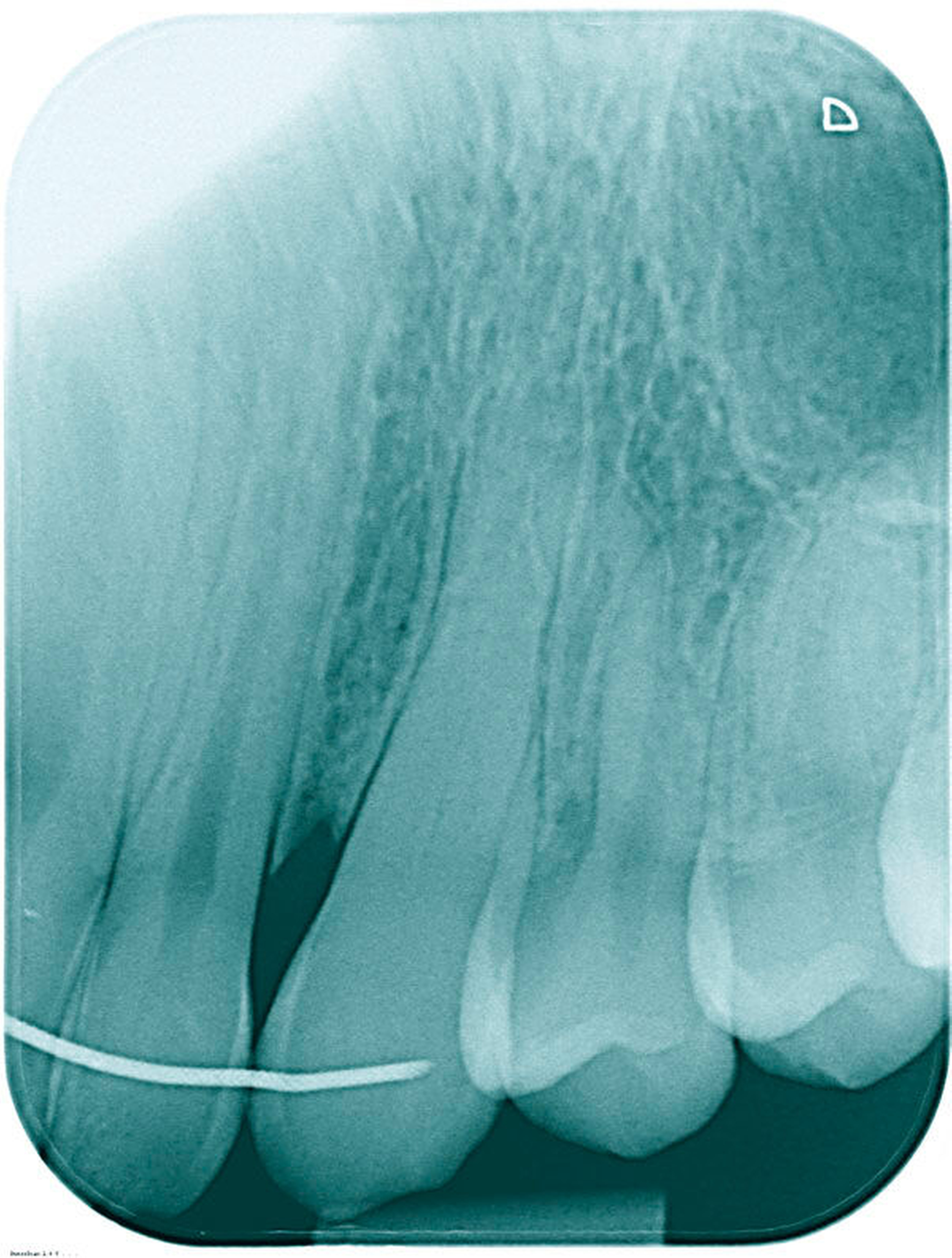 Aus der zahnärztlichen Anamnese ging hervor, dass der impaktierte Zahn 23 mittels chirurgisch-kieferorthopädischer Extrusion vor drei Jahren in die Zahnreihe eingegliedert wurde.