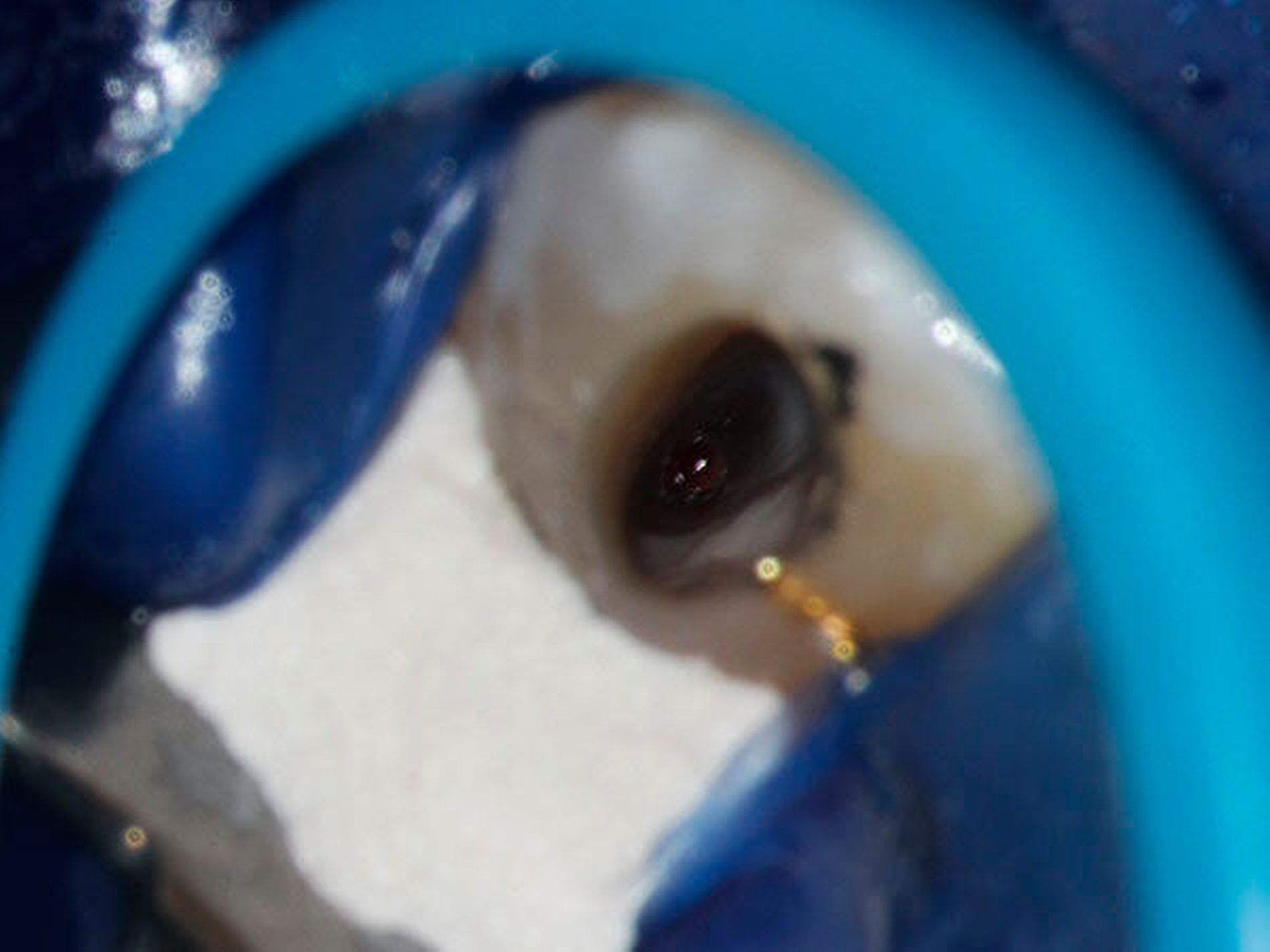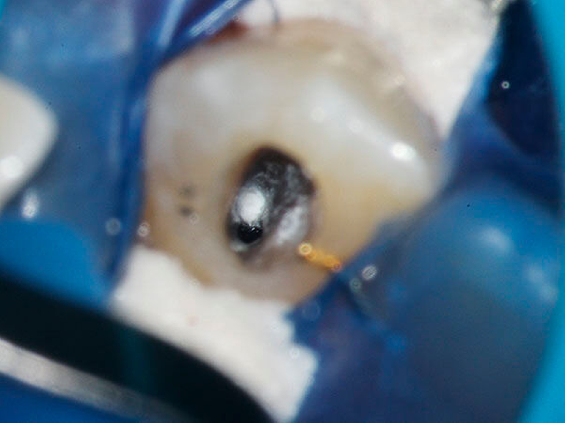In der folgenden Sitzung wurde die Schiene angepasst (Abbildung 10), die Trepanationsöffnung ergänzt und die Bohrung mittels Endoseal-Bohrer auf die zuvor am DVT geplante Tiefe vorgenommen. Nach erfolgter Bohrung wurde der Kofferdam angebracht und das erschlossene Kanalsystem mit einer ISO 10 C-Feile sondiert (Abbildung 11). Die Endometrie ergab 23,5 mm. Eine Röntgenkontrastaufnahme mit einer ISO 15 K-Feile wurde angefertigt (Abbildung 12). Die mechanische Wurzelkanalpräparation erfolgte mit Reciproc Blue 25 und 40 (VDW, München), die Desinfektion mit NaOCl 5 Prozent und EDTA 17 Prozent. Die Perforation wurde mit Total Fill BC Root Repair Material (FKG, La Chaux-de-Fonds, Schweiz) abgedeckt (Abbildung 13). Im Anschluss wurde eine Masterpointaufnahme angefertigt (Abbildung 14), der Wurzelkanal mit Total Fill BC Points und Sealer (FKG, La Chaux-de-Fonds, Schweiz) biokeramisch abgefüllt (Abbildung 15) und adhäsiv verschlossen. Bei der klinischen Nachuntersuchung nach vier Wochen war der Zahn symptomlos.