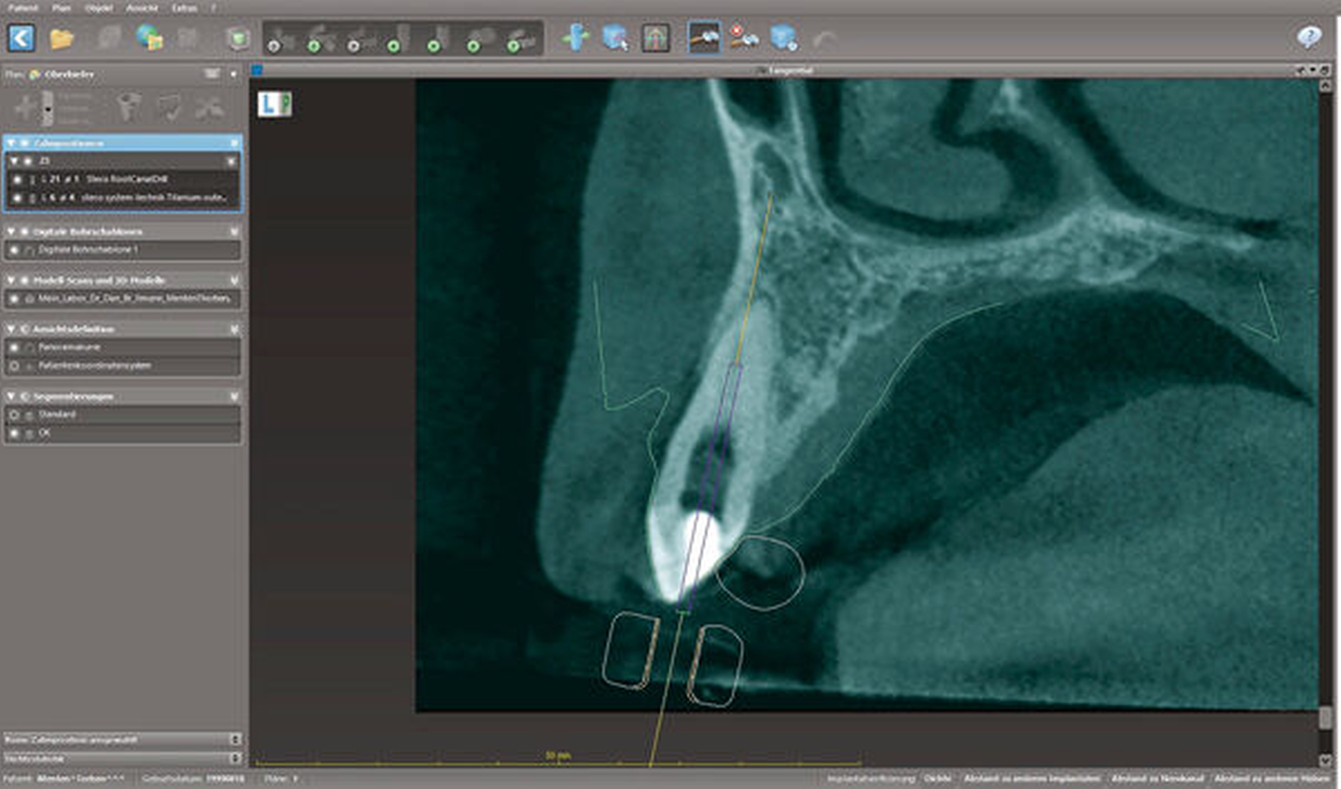 Computergeplante Bohrschablonen für die navigierte Implantation haben sich etabliert und gehören mittlerweile zu den Routineverfahren. In Anlehnung an diese Technik wurde das „Guided Endodontics“-Verfahren für die Therapie von obliterierten Wurzelkanälen entwickelt [Connert et al., 2018; Krastl et al., 2016]. Hierbei werden die DVT-Datensätze obliterierter Wurzelkanäle in eine Planungssoftware übertragen, mit den SLT-Daten von Intraoral- oder Model-Scans gematched und eine Navigationsschiene für den optimalen Zugang in das Kanalsystem geplant, die in Folge gefräst oder gedruckt wird. Studien zeigen, dass diese Technik eine präzise und reproduzierbare Methode zur Erschließung obliterierter Kanalsysteme ist [Connert et al., 2017; Zehnder et al., 2016].