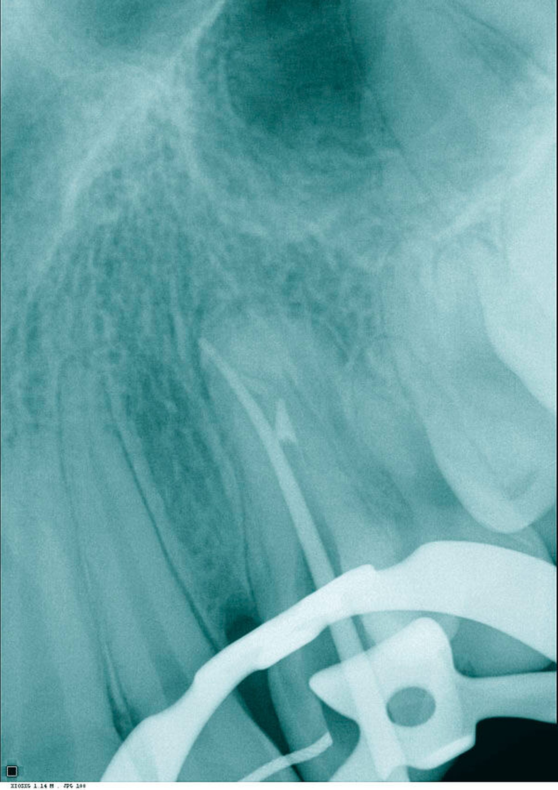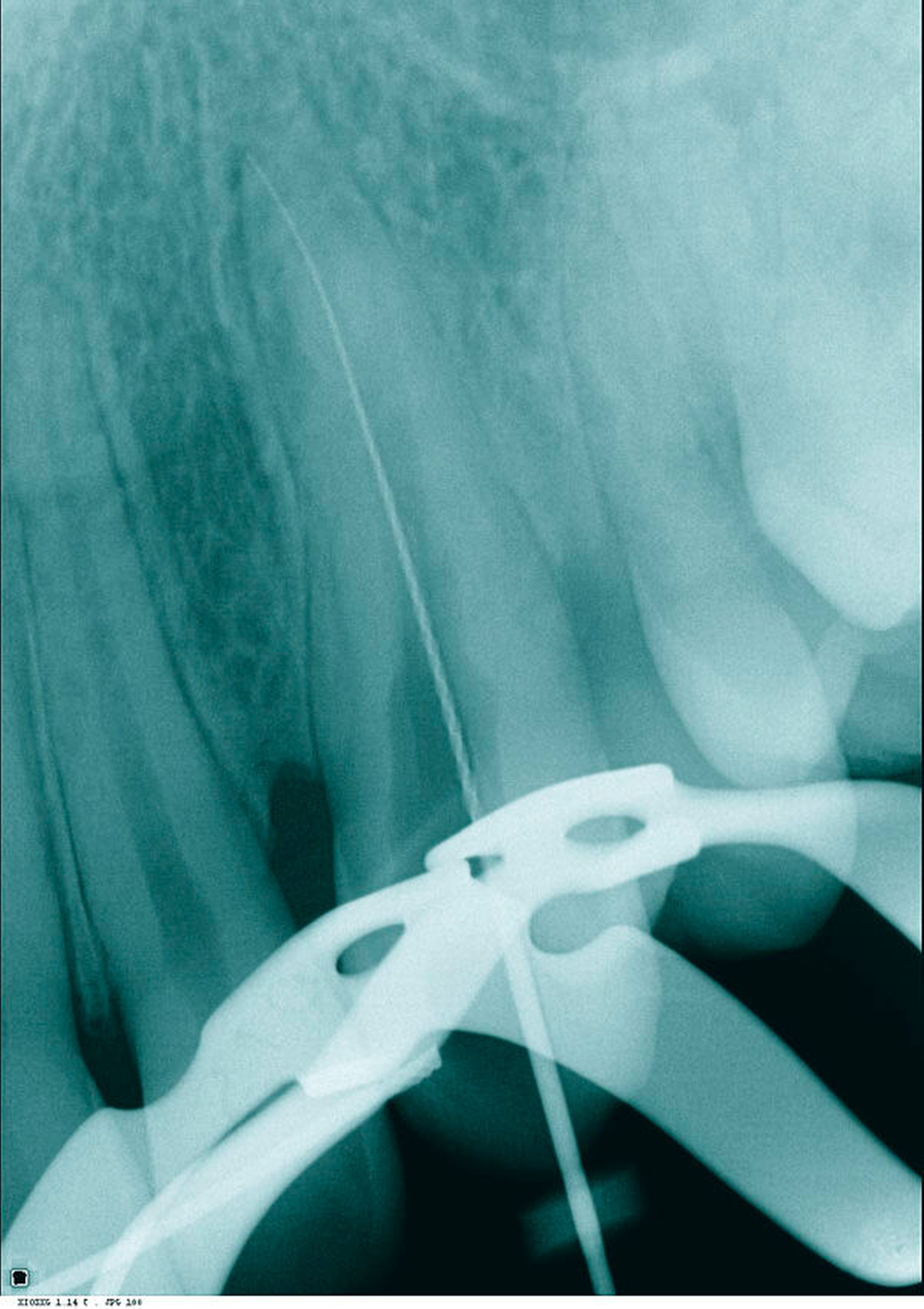Im vorliegenden Fall ist die Kalzifizierung vermutlich auf die hohe Krafteinwirkung durch die Extrusion zurückzuführen. Woloshyn et al. fanden bei 21 Prozent der Patienten mit impaktierten Eckzähnen kalzifizierte Kanäle nach chirurgisch-kieferorthopädischer Extrusion [Woloshyn et al., 1994]. Auch Ling et al. fanden mehr kalzifizierte Kanäle an Eckzähnen nach Extrusion als auf der kontralateralen Seite ohne Extrusion [Lint et al., 2007]. Dies lässt darauf schließen, dass gerade forcierte Kräfte ursächlich sein könnten.