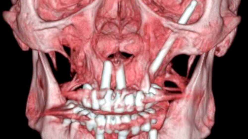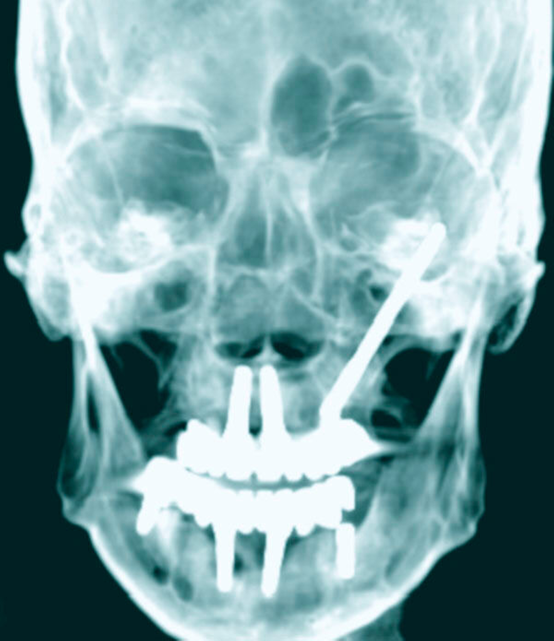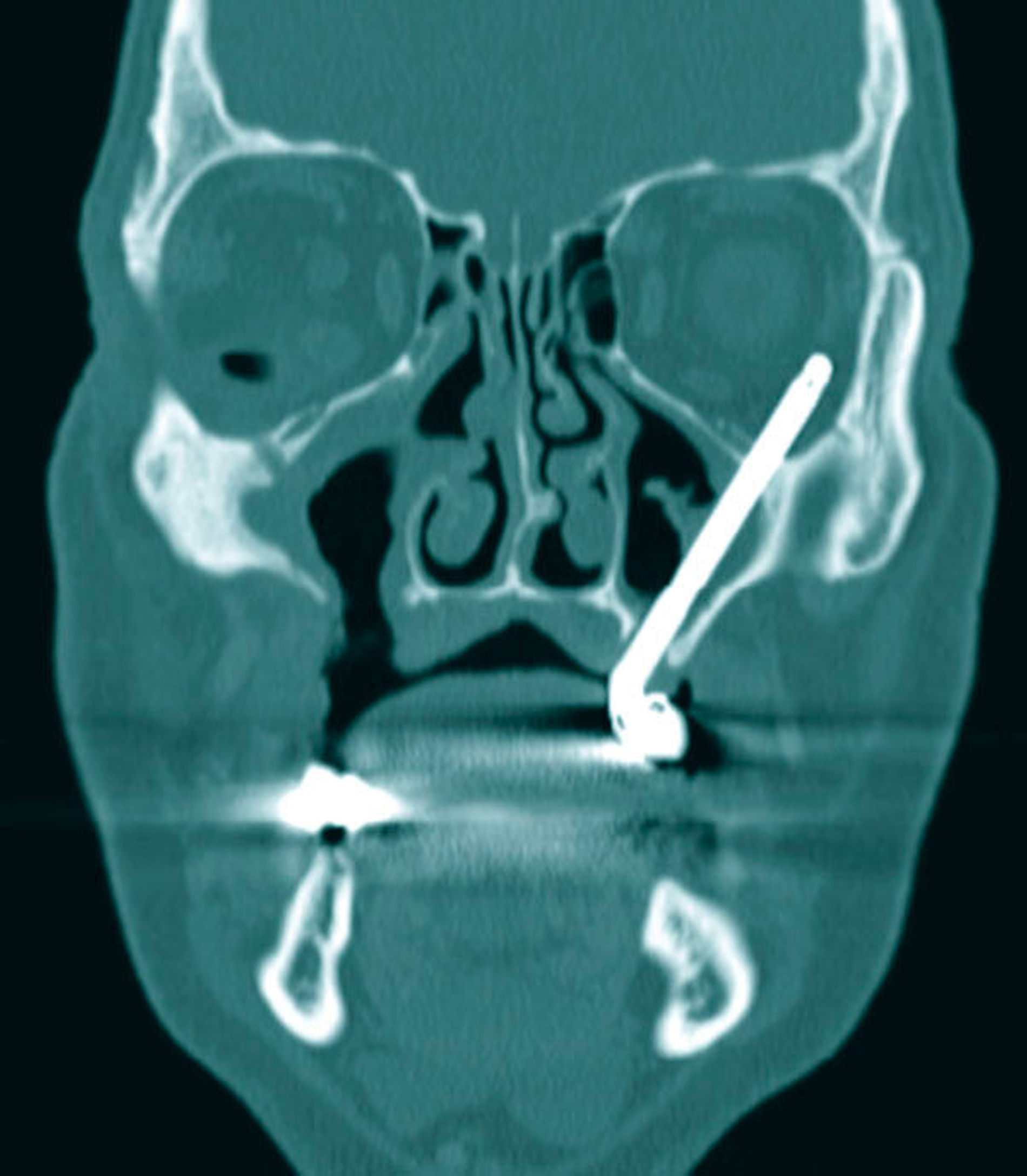 Als auffälliger Nebenbefund fand sich auch auf der linken Seite ein 60-mm-Zygoma-Implantat, das 17 mm in die linke Augenhöhle ragte. Neu aufgetretene Veränderungen oder Behinderungen in diesem Bereich waren vom Patienten subjektiv nicht wahrgenommen worden, die Implantation selbst lag bereits zehn Jahre zurück.