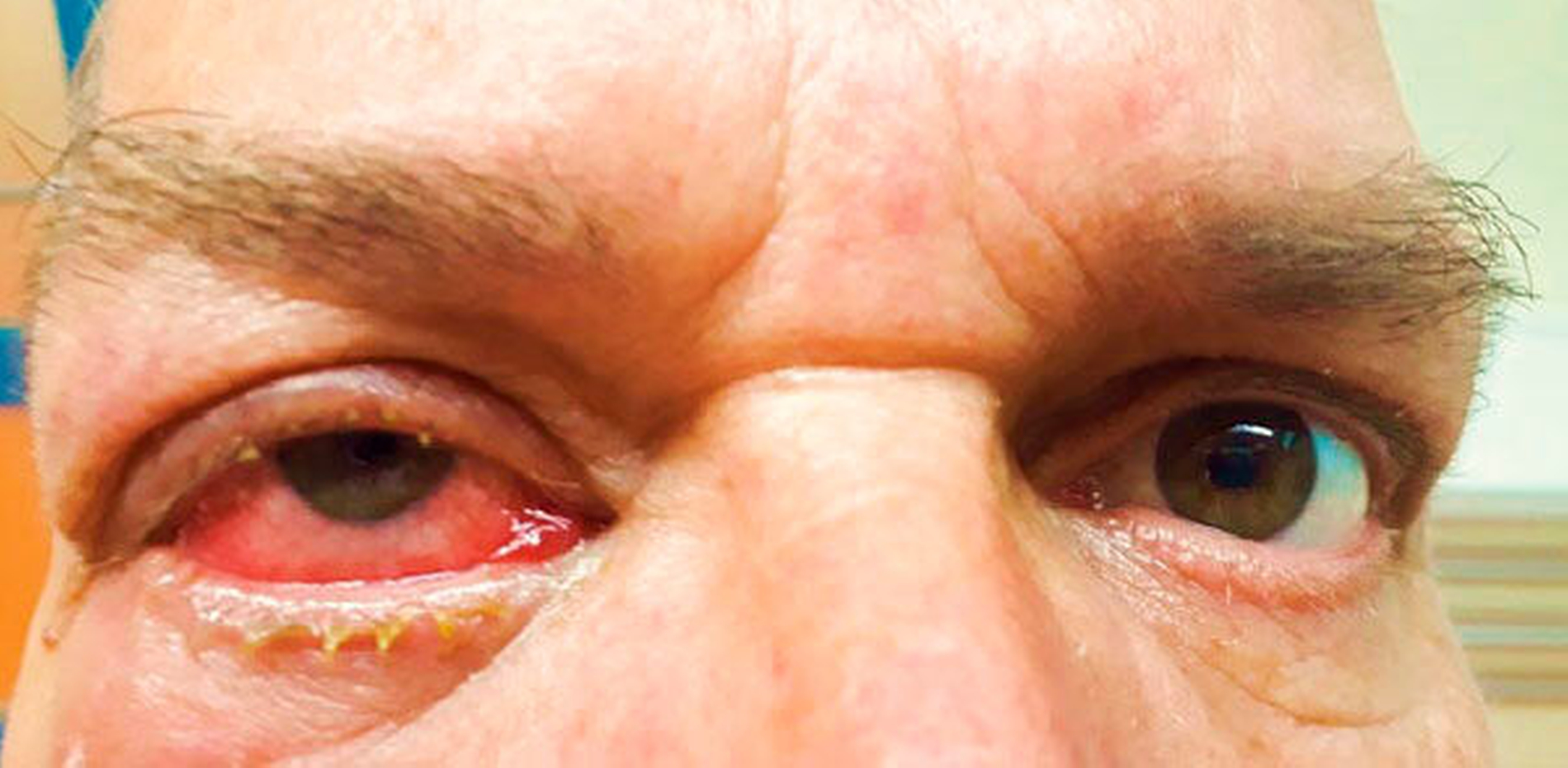 Klinisch zeigte sich ein altersentsprechender Allgemein- und Ernährungszustand. Die Symmetrie der Stirn war unauffällig. Im Bereich des rechten Jochbeins zeigte sich eine deutlich sichtbare Schwellung und Rötung. Die Pupillen waren seitengleich und der Visus rechts bei bekannter Amblyopie war leicht reduziert. Rechtsseitig zeigte sich eine Protusio Bulbi mit leichtem Lagophthalmus. Der Patient hatte Motilitätseinschränkungen in jede Richtung mit Doppelbilderwahrnehmung sowie einen erhöhten Augeninnendruck rechts, besonders beim Aufblick.