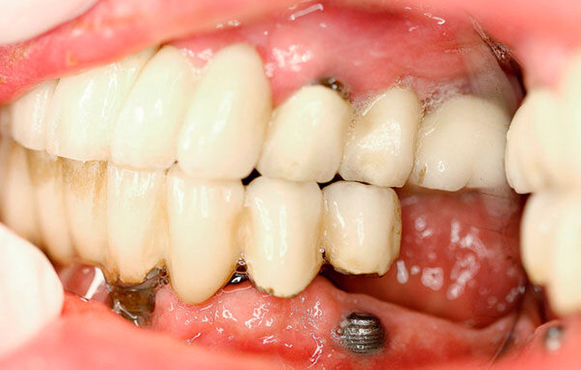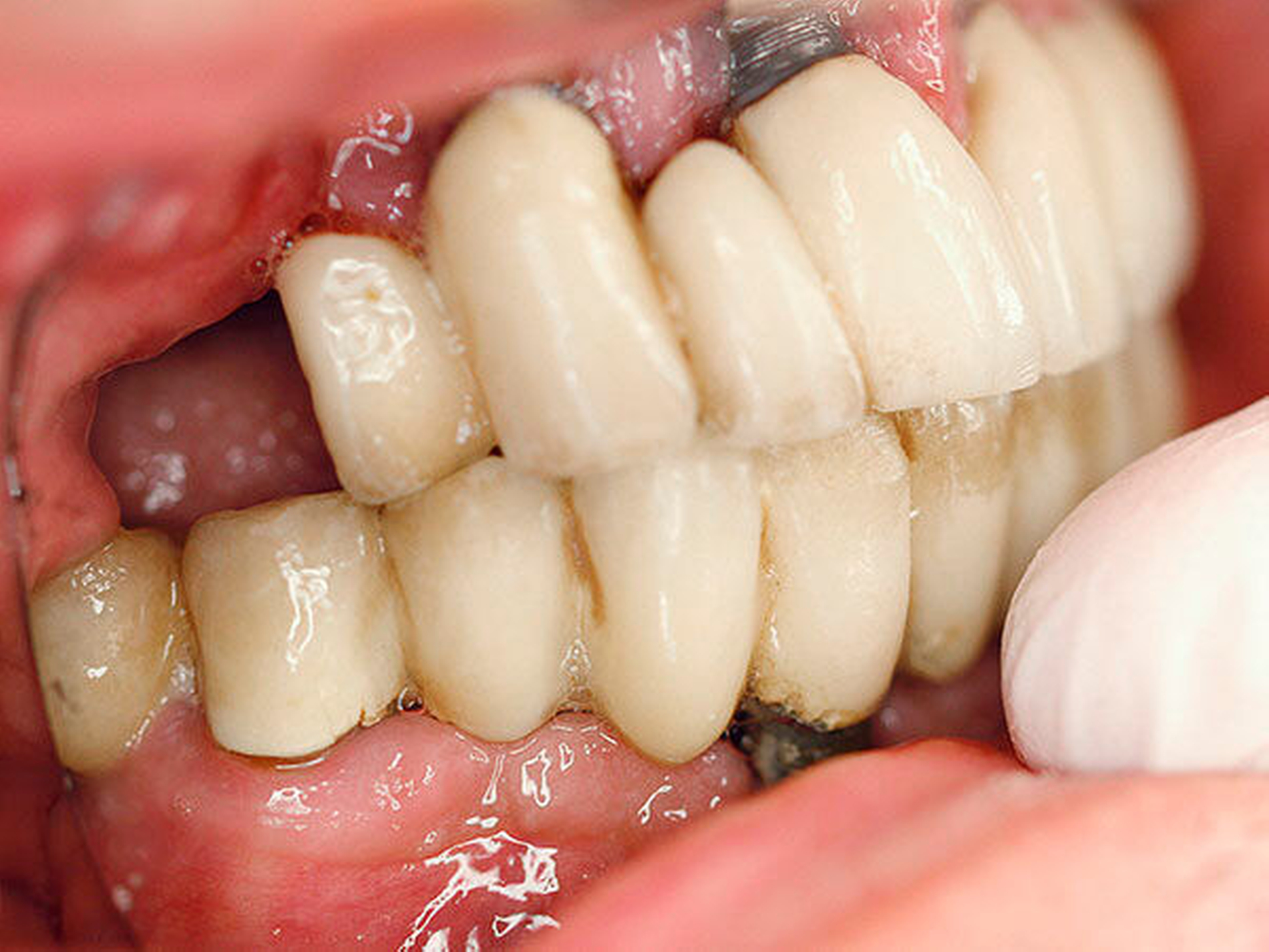 Intraoral zeigten sich implantatgetragene Kronen-Brückenkonstruktionen im Ober- und im Unterkiefer. Diese waren initial sowohl im Ober- als auch im Unterkiefer auf jeweils vier Implantaten befestigt. Im Bereich des rechten Oberkiefers zeigte sich in Regio 16 eine Mund-Antrum-Verbindung, die offenbar nach dem Versuch einer primären plastischen Deckung weiterbestand. Es bestand eine breite Dehiszenz bis ins Kieferhöhlenlumen hinein. An allen Implantaten zeigte sich eine chronische Periimplantitis mit ausgeprägtem Knochenabbau und freiliegenden oberen Gewindegängen.