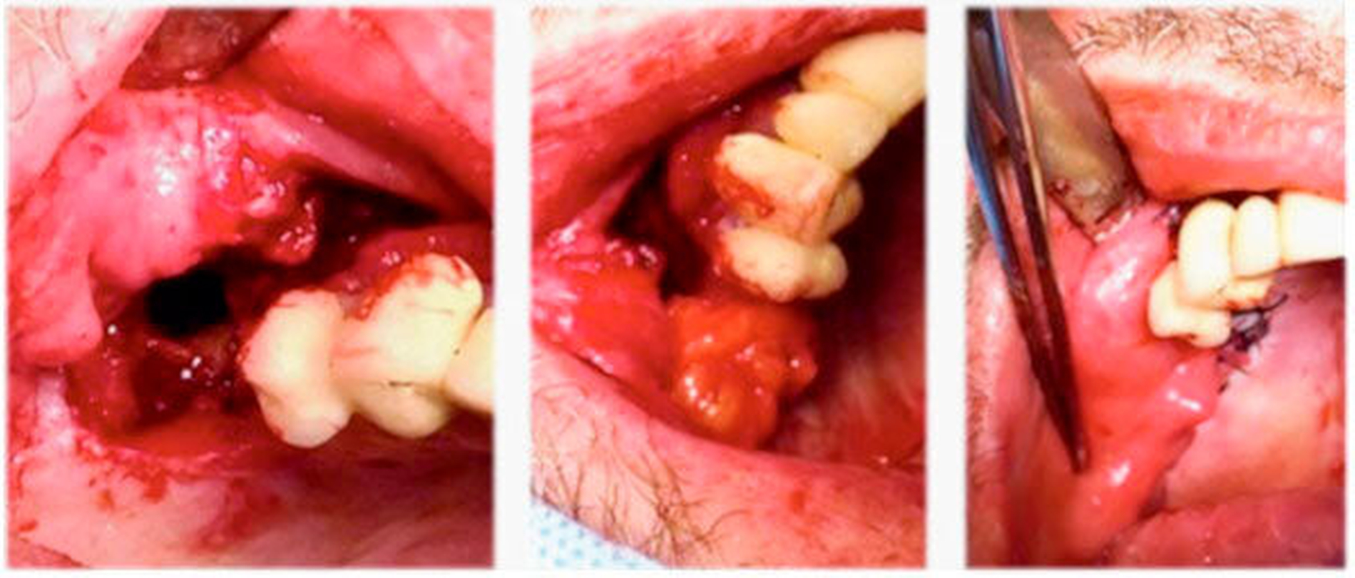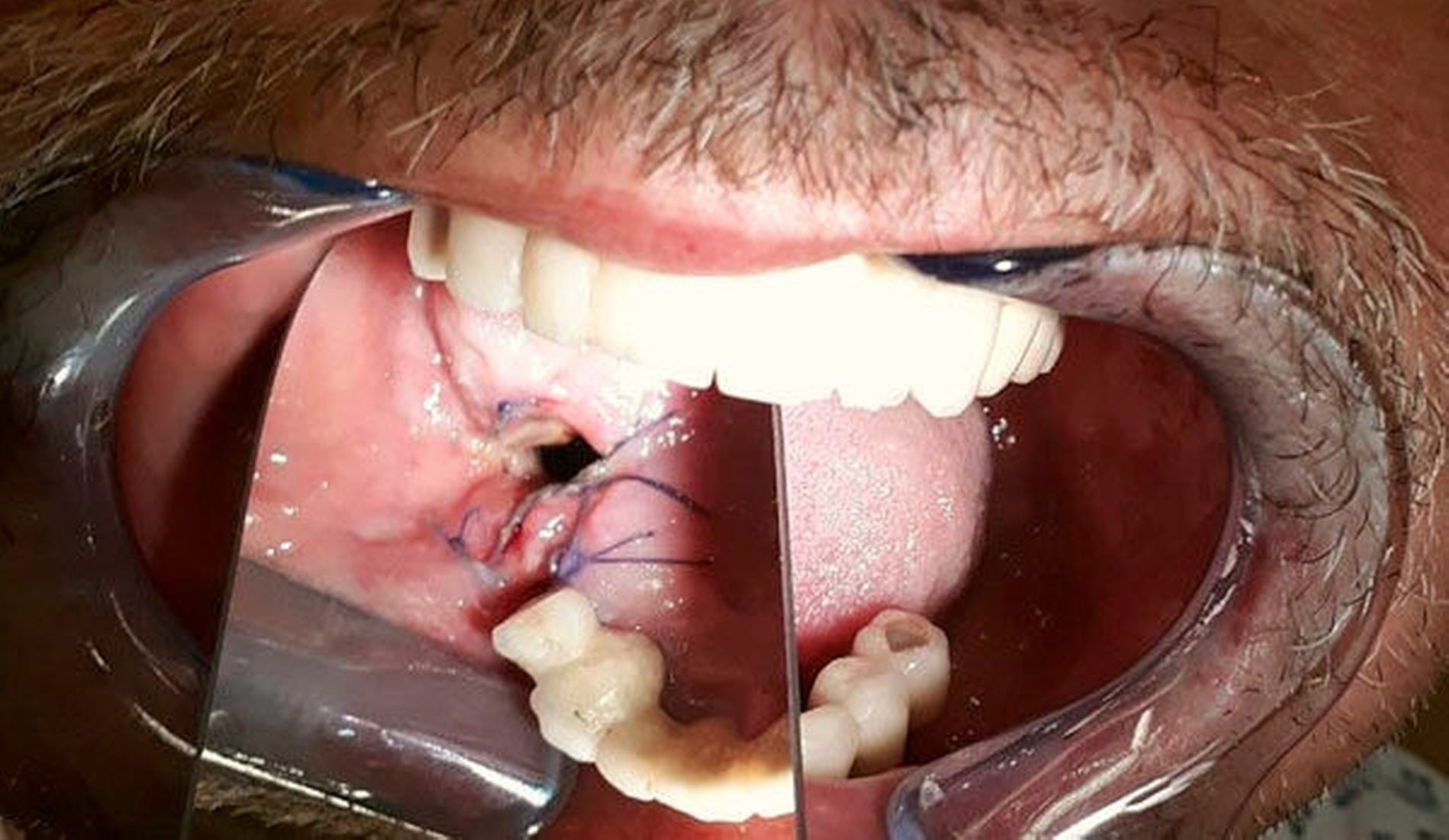 Die bestehende Mund-Antrum-Verbindung wurde nach Rücksprache mit dem Patienten am vierten stationären Tag in Lokalanästhesie geschlossen. Im Einzelnen wurden die Wundränder angefrischt, der Bichat‘sche Fettkörper dargestellt und mit Vicryl eingenäht, bevor der abschließende plastische Verschluss mit horizontalem Verschiebelappen und Periostschlitzung durchgeführt werden konnte.