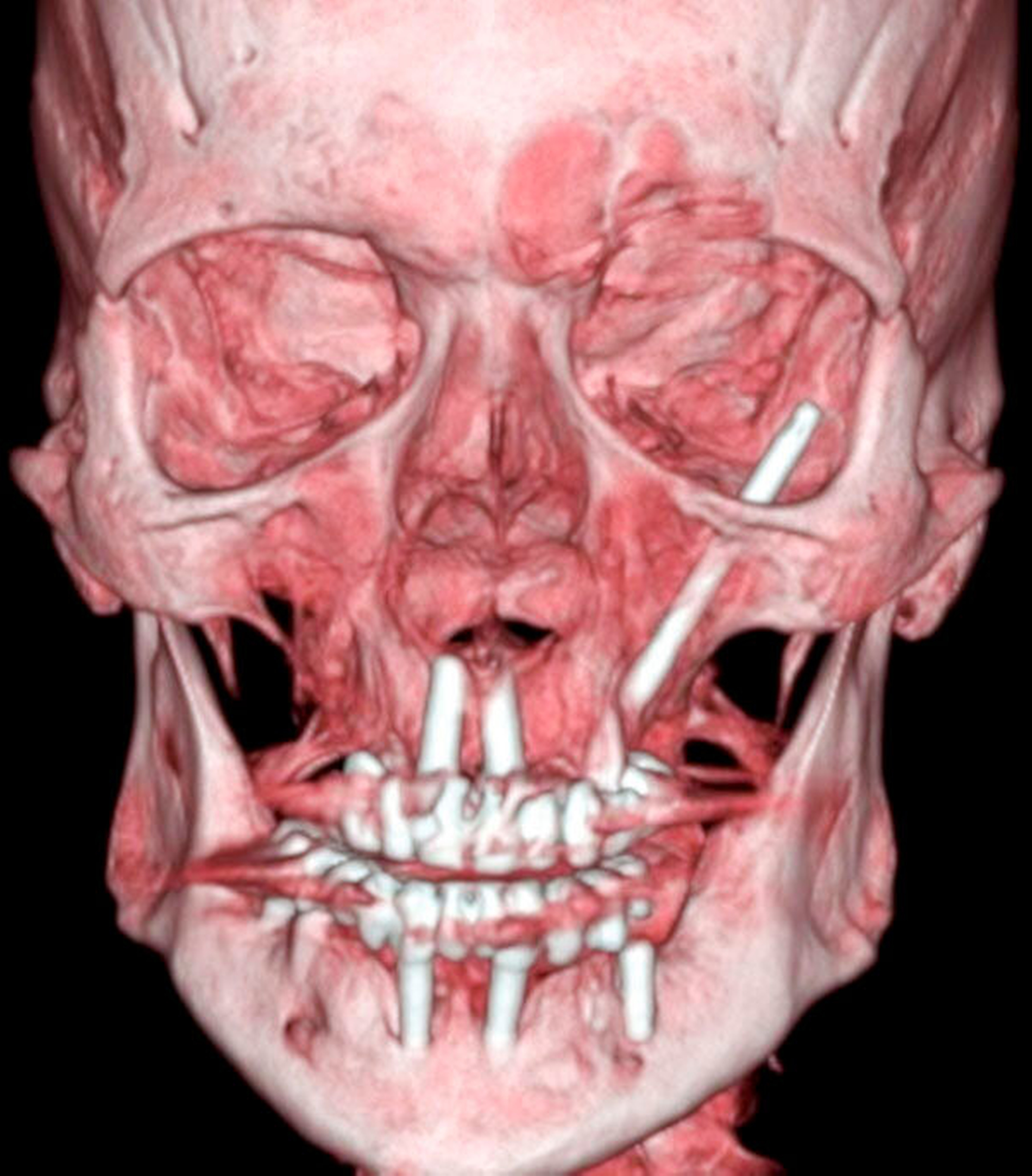Zur weiteren Abklärung erfolgte nach zweidimensionaler Beurteilung die dreidimensionale Rekonstruktion der CT-Daten. Hierbei kamen die röntgenopaken Implantate im Kiefer sehr gut zur Darstellung und konnten in Bezug auf deren anatomische Lage beurteilt werden. Im atrophen Ober- und Unterkiefer zeigte sich ein mittelgradiger horizontaler Knochenabbau mit vertikalen Einbrüchen an allen Implantaten. In der rechten Maxilla regio 016 bestand nach Explantation eines rechtsseitigen Zygoma-Implantats ein circa 2 cm großer Defekt, der, aufgrund der verdrängten Weichgewebe und Lufteinschlüsse sicher bis in die mittlere, zentrale Orbita reichte.