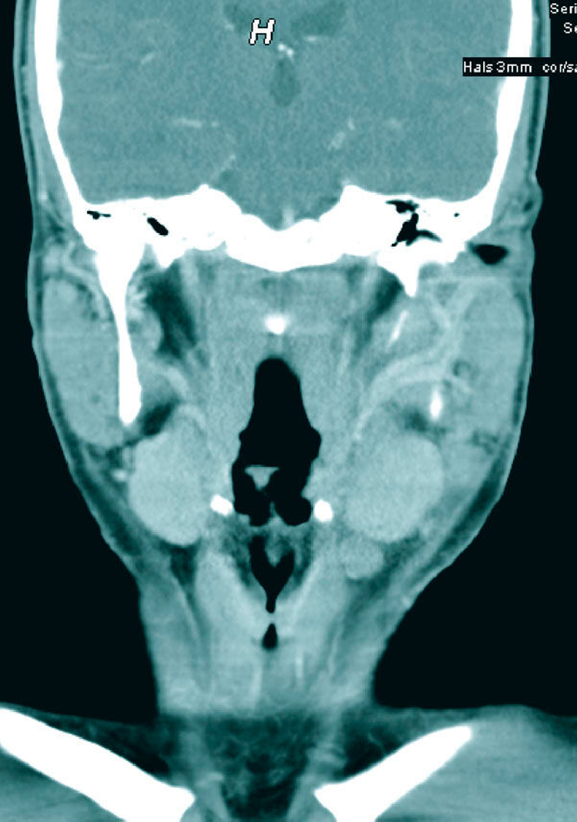 Die serologische Blutuntersuchung ergab eine starke Erhöhung der C-reaktiven Proteine und der Leukozyten. Im Ultraschall und in der Kontrastmittel-verstärkten Computertomografie (CT) ließ sich eine Vergrößerung der zervikalen Lymphknoten darstellen (Abbildungen 1 und 2). Weitere Befunde oder Foci ließen sich nicht nachweisen.