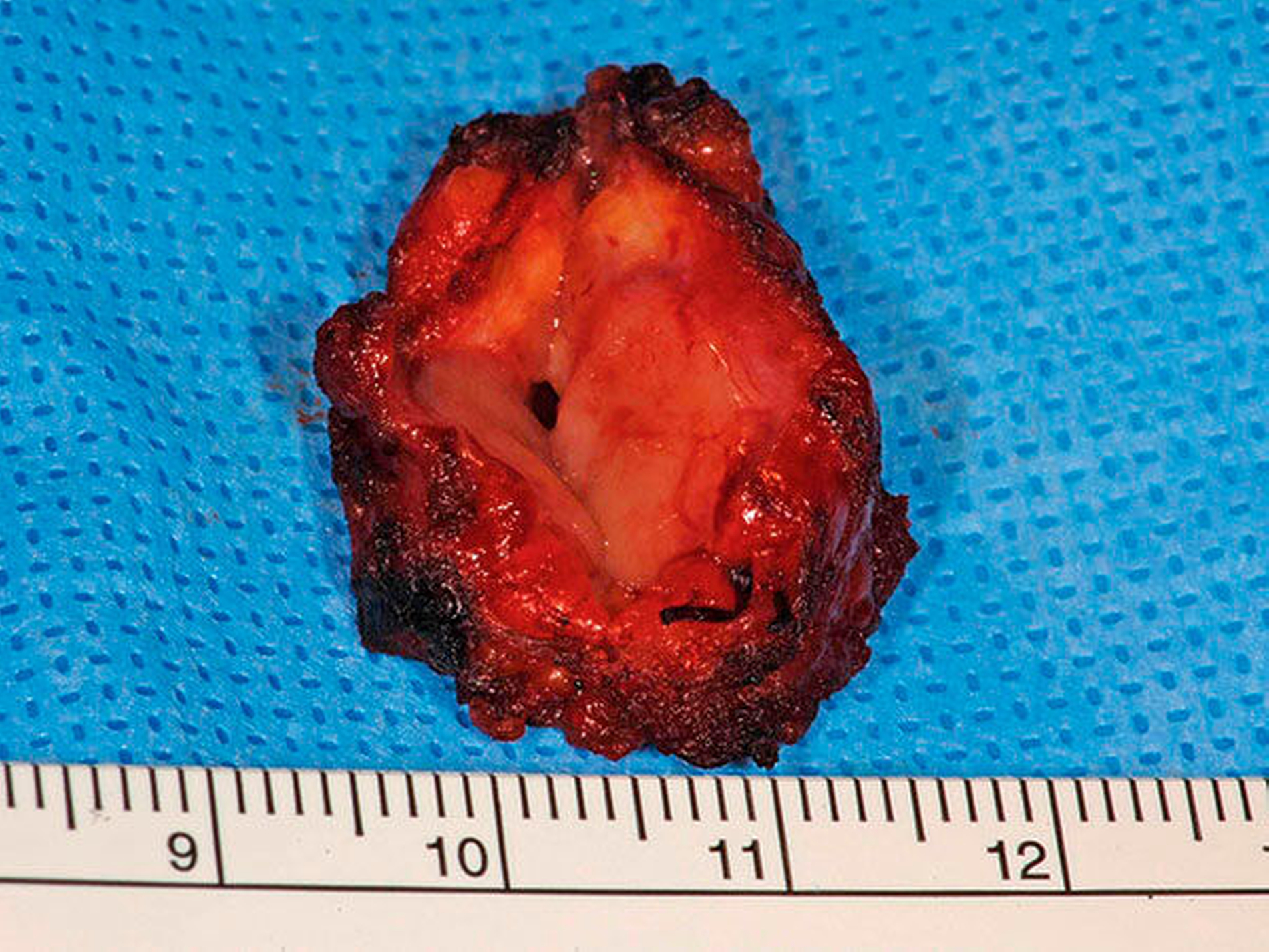 Da die Schwellung nach mehreren Tagen unter antibiotischer Therapie jedoch nicht abnahm und eine weitere diagnostische Abklärung am Präparat sinnvoll erschien, erfolgte die operative selektive Entfernung des Prozesses in einer kurzen Intubationsnarkose (Abbildungen 3 und 4). Bei der Eröffnung des resezierten Präparats entleerte sich putride Flüssigkeit (Abbildung 5).