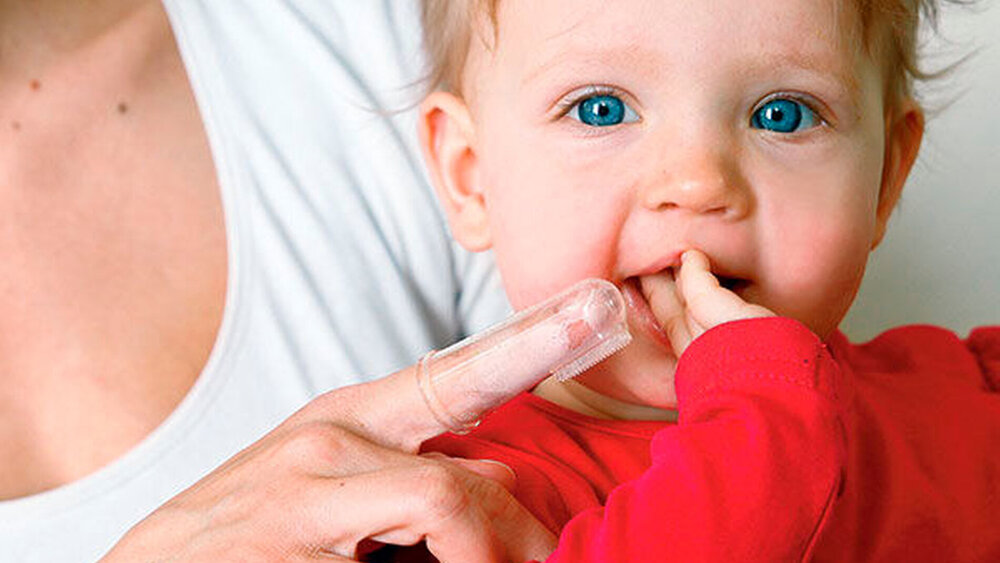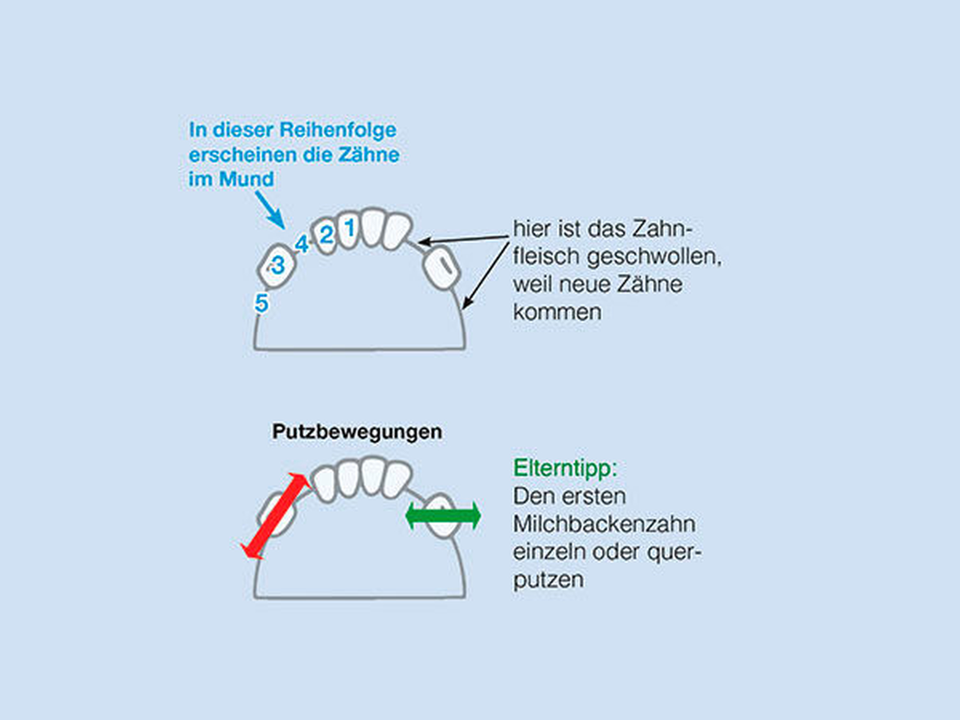 Noch bevor der erste Zahn im Kindermund erscheint, soll das Kind selbst mit einer Zahnbürste oder einem Beißring mit integriertem Zahnbürstenkopf spielen dürfen. Die Zahnbürste soll in den Mund, bevor der erste Zahn erscheint, denn dann ist das Spiel reine Lust, reines Vergnügen. Kommt zur Zahnbürste der Zahn hinzu, kommt der Zweck/die Funktion der Zahnbürste ins Spiel: Der rein zweckgebundene Einsatz einer Zahnbürste kann beim Kind Abwehr erzeugen. Der spielerische Einsatz der Zahnbürste vor dem ersten Zahn verringert die Abwehrhaltung eines Kindes entscheidend. Aus diesem Grund machen Eltern gute Erfahrungen mit ihrem Kind, wenn sie zum Fühlen und zur Massage des Kieferkamms einen Fingerling genommen haben und diesen dann fürs Erste-Zähne-sauber-putzen verwenden. Das Kind ist an den Fingerling gewöhnt, bevor der erste Zahn erscheint. Jetzt kommt auf den Fingerling nur noch eine Reiskorngröße fluoridhaltiger Kinderzahnpasta und in fünf bis zehn Sekunden sind die ersten Stückchen Zahn plaquefrei „geputzt”.