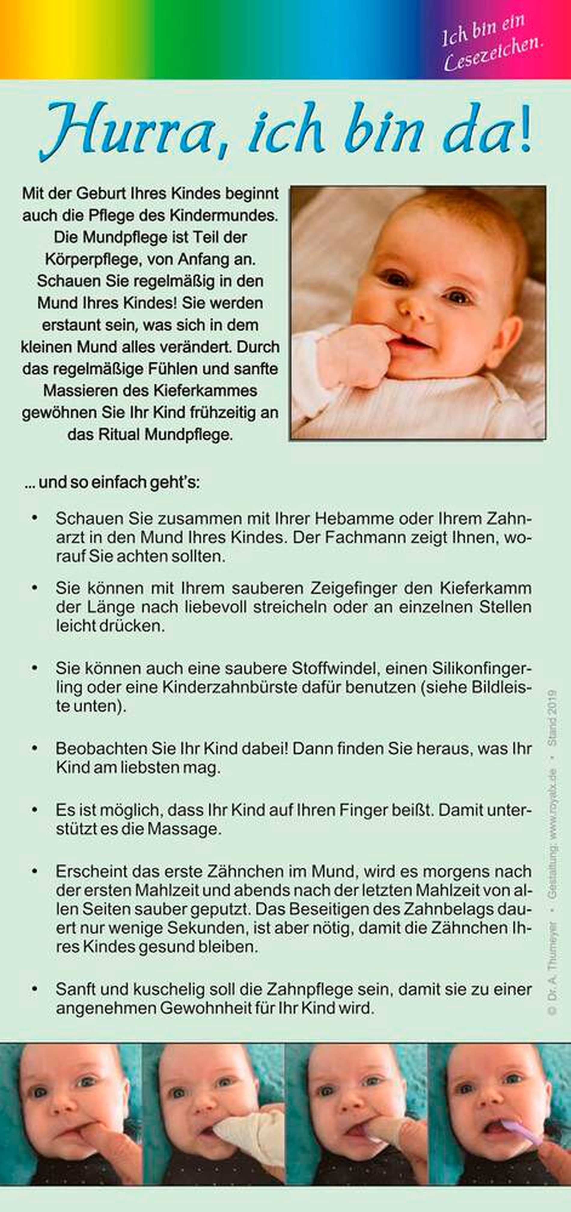 „Hurra, ich bin da!” heißt das Faltblatt (Abbildung 1), das man den Eltern nach dem „Begreifen“ der Zähne ihres Kindes mit nach Hause geben kann. Auf YouTube finden Eltern auf dem Zahnputz-Zauberkanal kurze Videosequenzen, die ihnen ermöglichen, das Gelernte zu Hause in aller Ruhe nochmals anzuschauen. Ob sich Eltern mit einem sauber gewaschenen Finger im Kindermund wohl fühlen oder ihren Finger lieber mit einer Mullwindel oder einem Fingerling schützen, sollte den Eltern zur Auswahl gestellt werden.