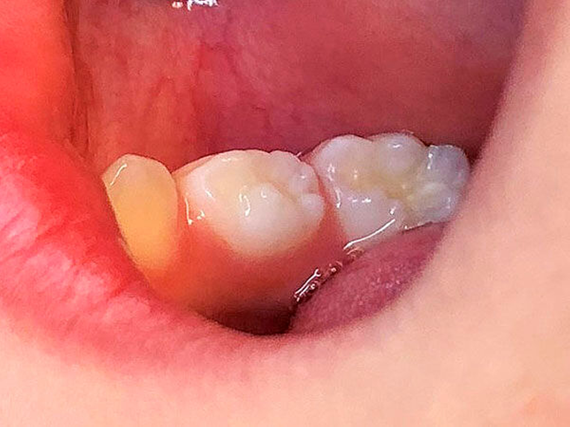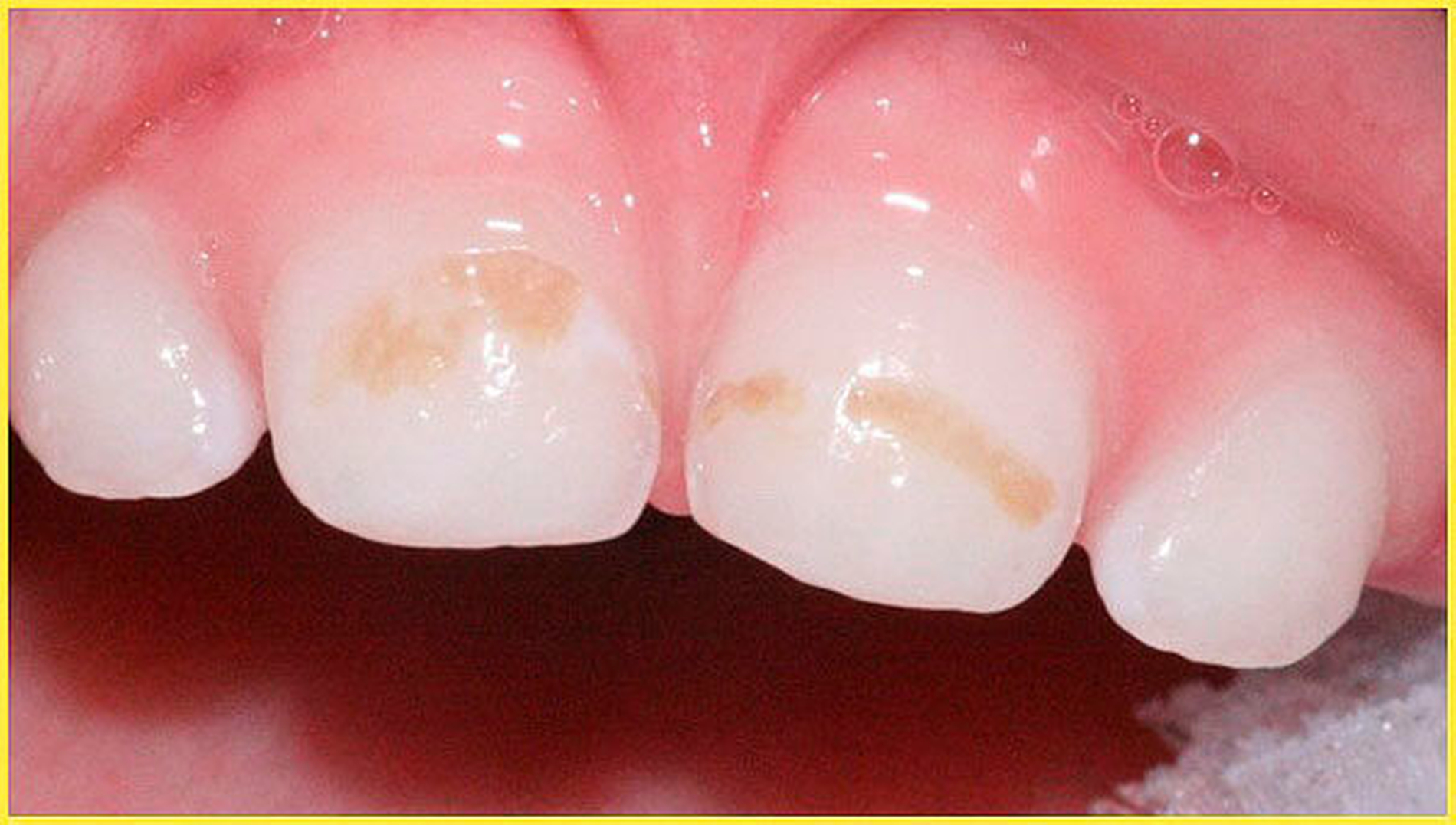 Ist das Lippenbändchen stark ausgeprägt, verläuft es breit und fleischig bis zur Papilla incisiva hin, dürfen die Eltern nicht horizontal mit der Zahnbürste über die zarte, empfindliche Schleimhaut schrubben. Sie müssen dann die Milchfrontzähne einmal von rechts und einmal von links getrennt reinigen. Die Plaque muss nur gelockert werden! Eltern, die es besonders gut machen wollen, neigen oft zu zu viel Druck. Beides ist dem Kind unangenehm. Brechen die Milchzähne hinter dem breitflächigen Lippenbändchen durch, ist das Kariesrisiko höher, weil es für die Eltern schwieriger ist, den Zahnfleischrand zu erreichen. Trotz der Zahnpflege durch die Eltern können kariöse Läsionen entstehen (Abbildung 3).