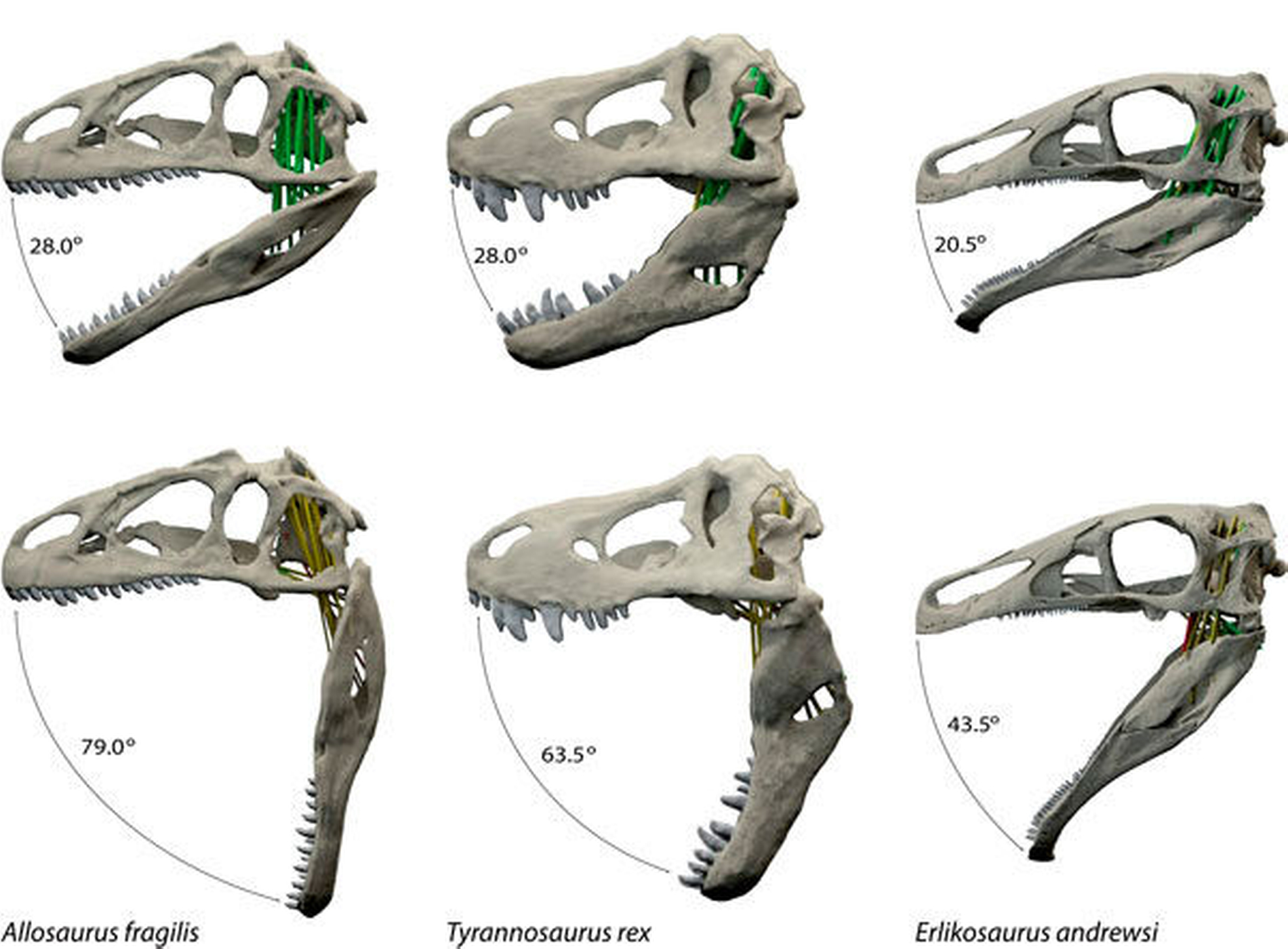 Raubsaurier gemäß Jurassic Park mit weit aufgerissenen Mäulern darzustellen, ist also richtig: Allosaurus fragilis konnte demnach eine Rachenöffnung von bis zu etwa 79 Grad erreichen, T. rex kam auf eine Maximalweite von 63,5 Grad. Die stärkste Beißkraft beim T. rex, der immerhin auf eine Kraft von 57 Kilonewton pro Quadratzentimeter kam und somit den Rekord beim Zubeißen unter den Dinosauriern hielt, lag bei einem Winkel von 30 Grad. Da der Schädel des Tyrannosaurus allerdings mit einer Länge von 1,5 Metern rund ein Drittel länger als der des Allosaurus war, konnte er auch bei dem kleineren Öffnungswinkel sein Maul in eine ähnlich große Beute schlagen wie der Allosaurus. Außerdem stellten die Forscher fest, dass der T. rex auch bei anderen Öffnungswinkeln schon einen enormen Beißdruck ausübte.