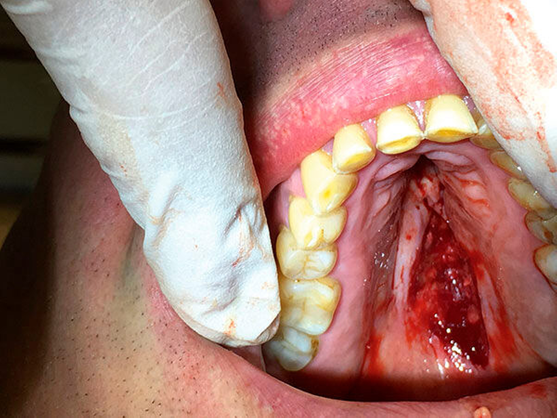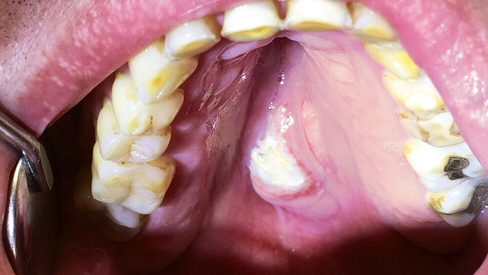 Bei der extraoralen Inspektion ergaben sich keine Besonderheiten. Intraoral zeigte sich eine etwa 3 cm große, erhabene, unverschiebliche, schmerzfreie Schwellung in der Gaumenmitte, am Übergang vom harten zum weichen Gaumen. Diese war vom Tastbefund prall elastisch, die Oberfläche ulzeriert und fibrinbelegt. Die Ränder des Befunds waren gerötet. Die Palpation der Halsregion ergab keine Auffälligkeit.