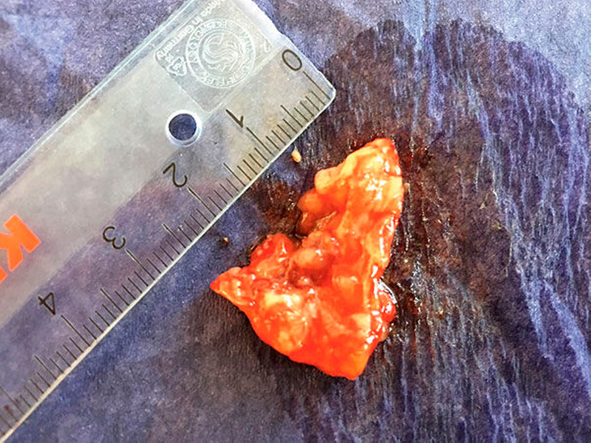 Die digitale Volumentomografie zeigte einen weichgeweblichen Tumor – bei vollständiger Erhaltung der Kontinuität des knöchernen Gaumens. Nach ausführlicher Aufklärung des Patienten wurde die Veränderung mit Verdacht auf ein pleomorphes Adenom in Lokalanästhesie vollständig exzidiert und der pathohistologischen Befundung zugeführt. Postoperativ wurde eine Verbandplatte eingebracht, unter der die Wunde sekundär granulierte. Die Heilung verlief komplikationslos. Nach vier Wochen war die Wunde vollständig epithelialisiert.