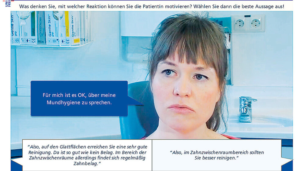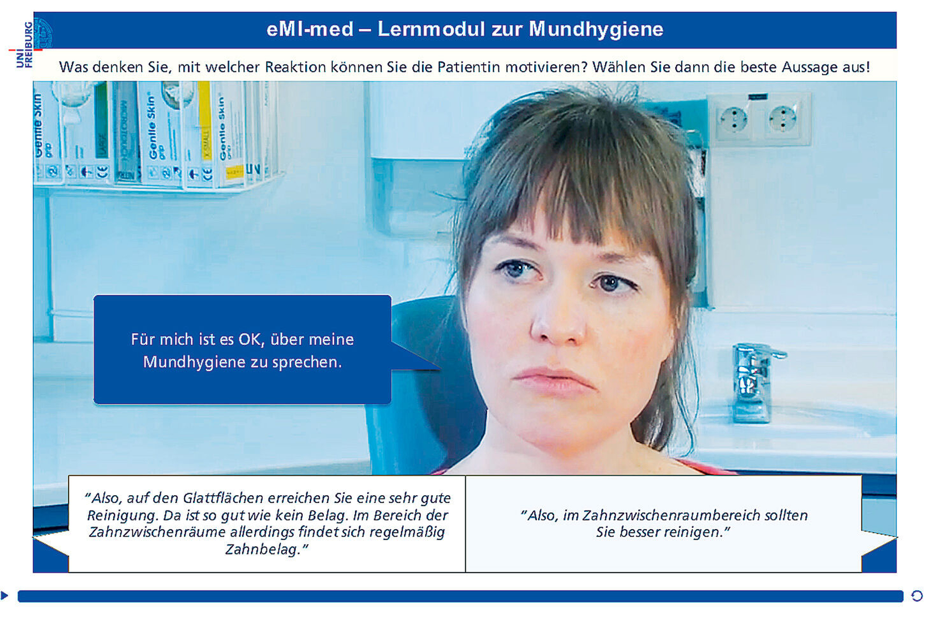 Eine Besonderheit des E-Learning-Angebots neben den E-Lectures sind simulierte interaktive Gesprächssequenzen, bei denen der Anwender unterschiedliche kommunikative Entscheidungen treffen kann und dementsprechende Reaktionen des simulierten Patienten erhält (Abbildung). Für die simulierten Gesprächssequenzen stehen sowohl Beispiele für Mundhygieneförderung als auch zur Raucherentwöhnung zur Verfügung.
