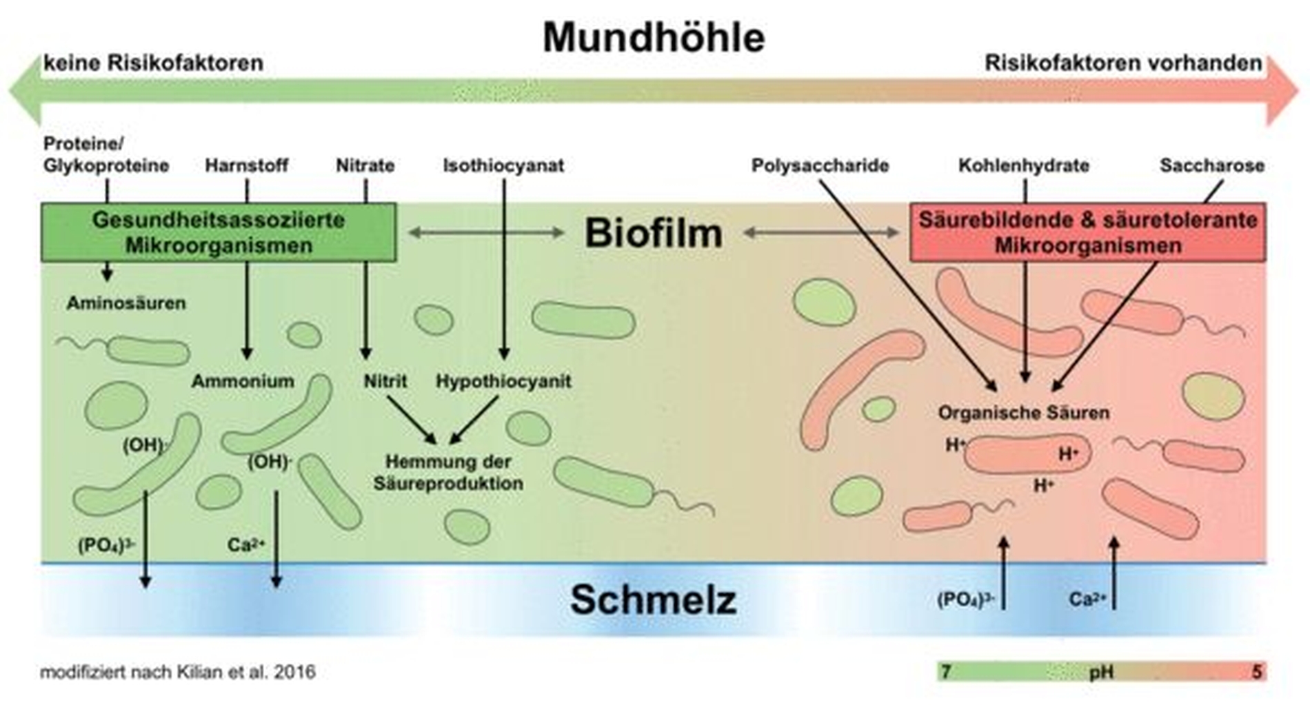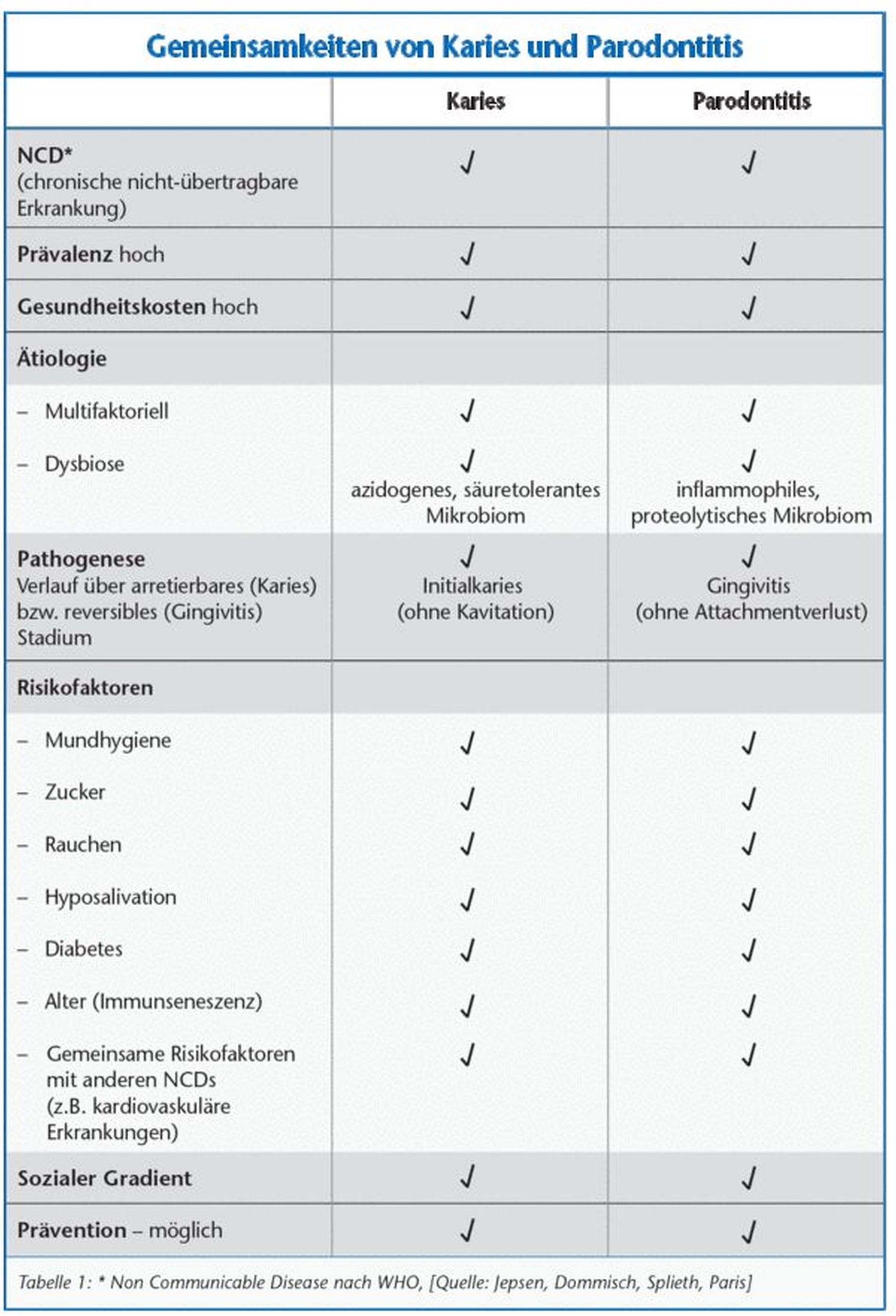 Trotz unterschiedlicher Erkrankungsbilder teilen Karies und Parodontitis eine Reihe gemeinsamer Risikofaktoren. Im Mittelpunkt stehen dabei die Prozesse im oralen Mikrobiom und die damit verbundenen Einflüsse und Wechselwirkungen in und mit den hier vorhandenen Biofilmen. Die Entstehung und das Fortschreiten beider Erkrankungen ist gekoppelt an Plaqueakkumulation und Veränderungen in den mikrobiellen Wechselwirkungen.