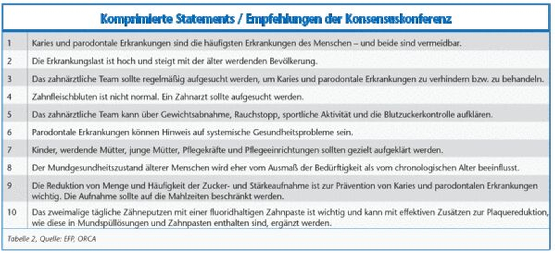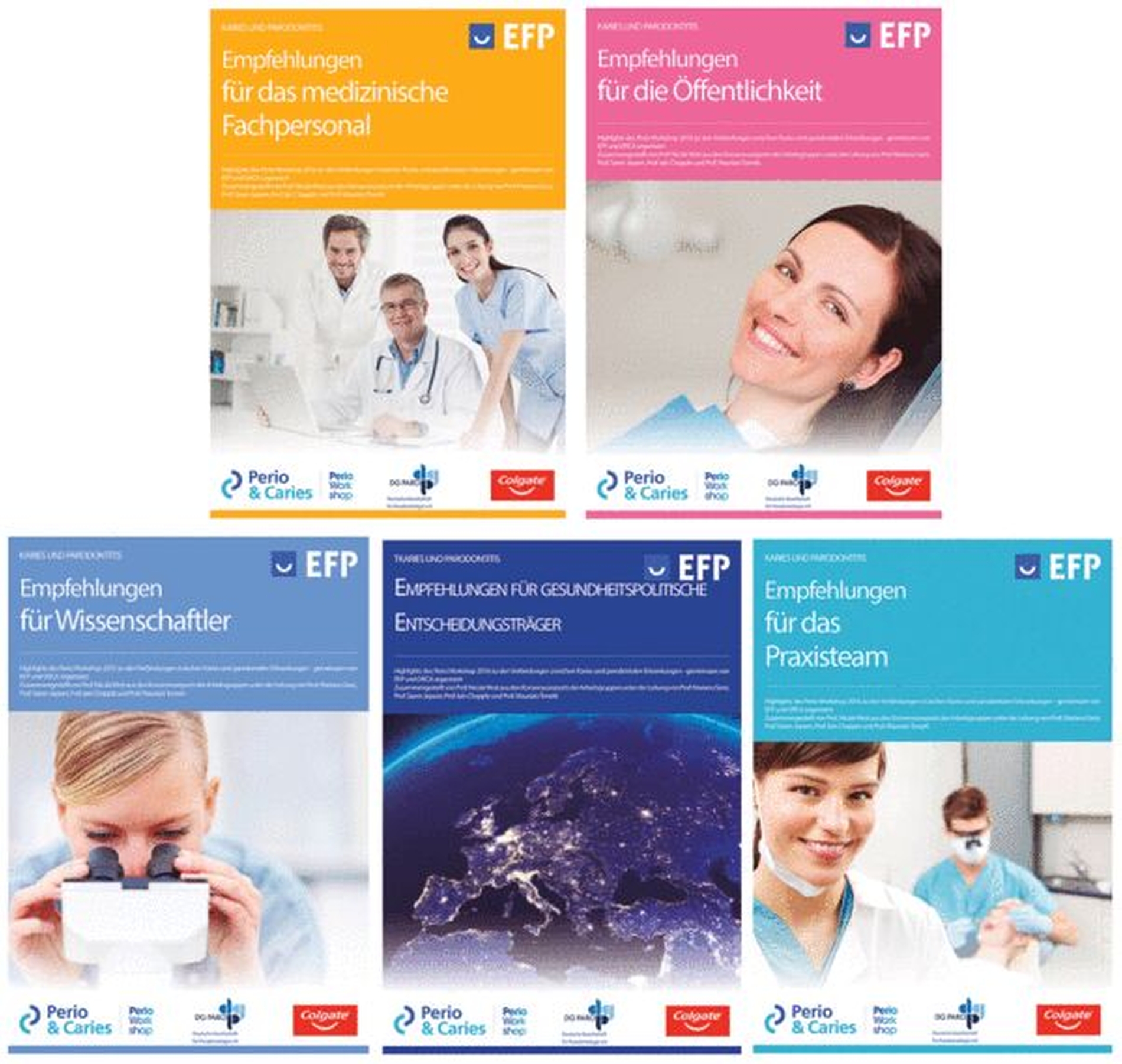 Karies und Parodontitis sind die häufigsten Erkrankungen der Menschheit. Das Konsensusprojekt hatte sich daher auch zum Ziel gesetzt, präzise formulierte Präventionsmaßnahmen sowohl für die individuelle als auch für die bevölkerungsweite Vorsorge zu verabschieden. Im Jahr 2018 folgten verschiedene Broschüren, die sich mit konkreten evidenzbasierten Empfehlungen an verschiedene Zielgruppen – Praxisteams, Patienten, medizinisches Fachpersonal, Wissenschaft und gesundheitspolitische Entscheidungsträger – richten. Diese Broschüren erschienen zunächst in englischer Sprache und werden in Kürze auf Deutsch über die Deutsche Gesellschaft für Parodontologie e. V. (DG PARO) verfügbar sein (www.dgparo.de).